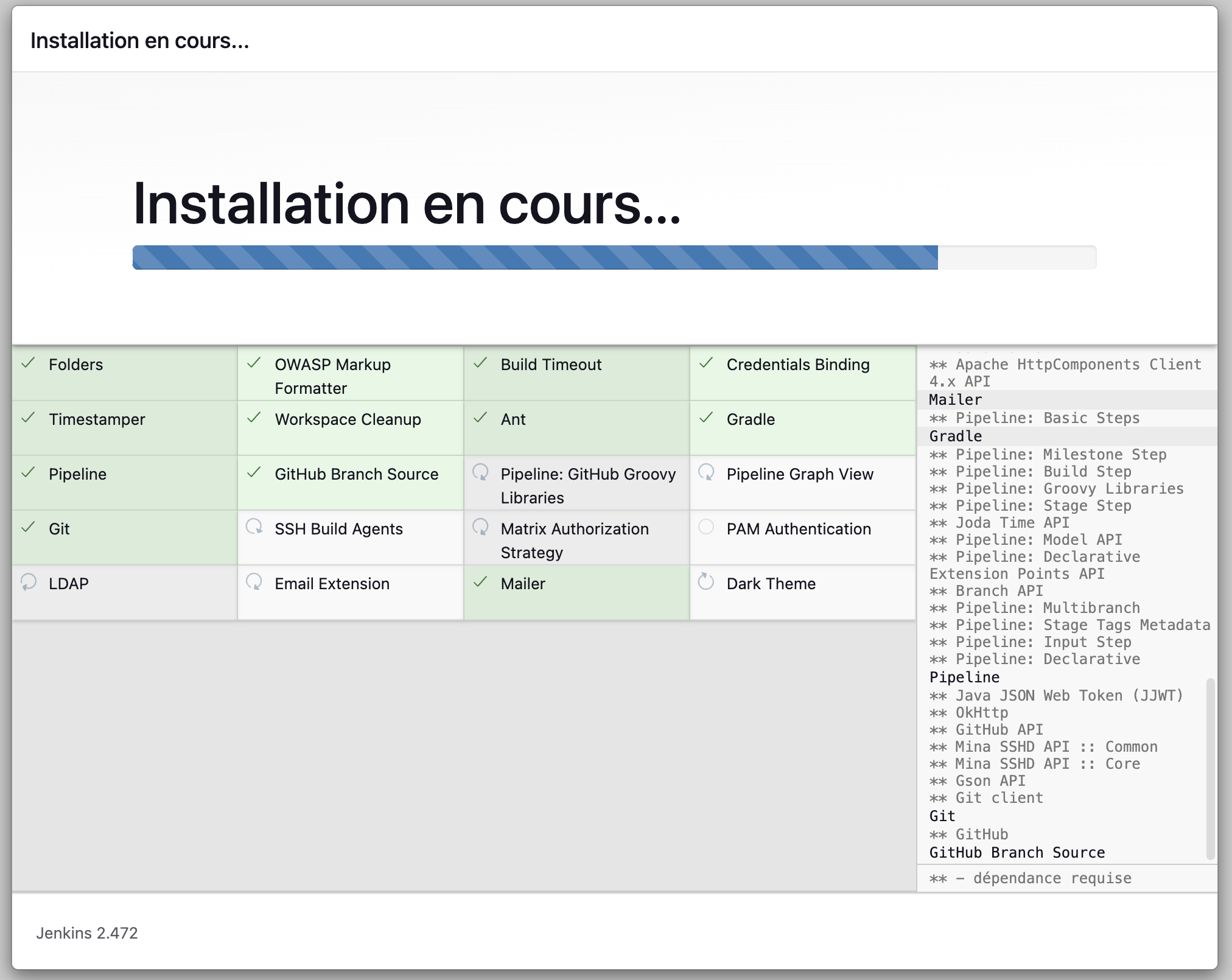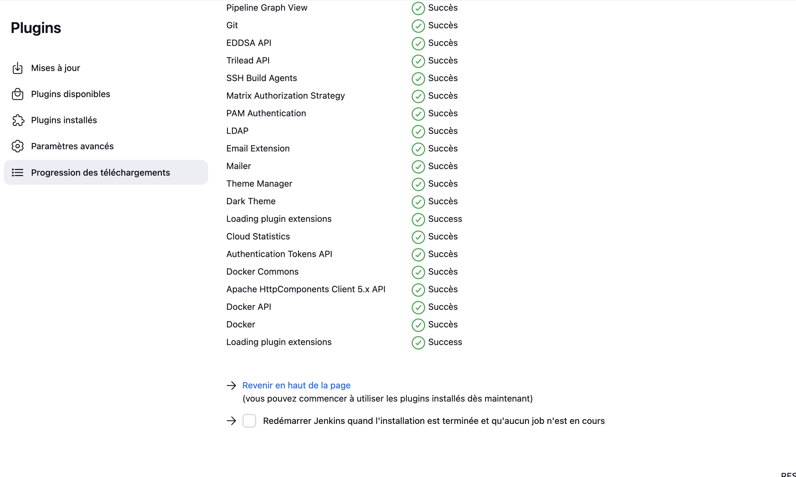 Vous pouvez apercevoir la progession de l'installation. N'oubliez pas de cocher l'option Redémarrer Jenkins quand l'installation est terminée et qu'aucun job n'est en cours