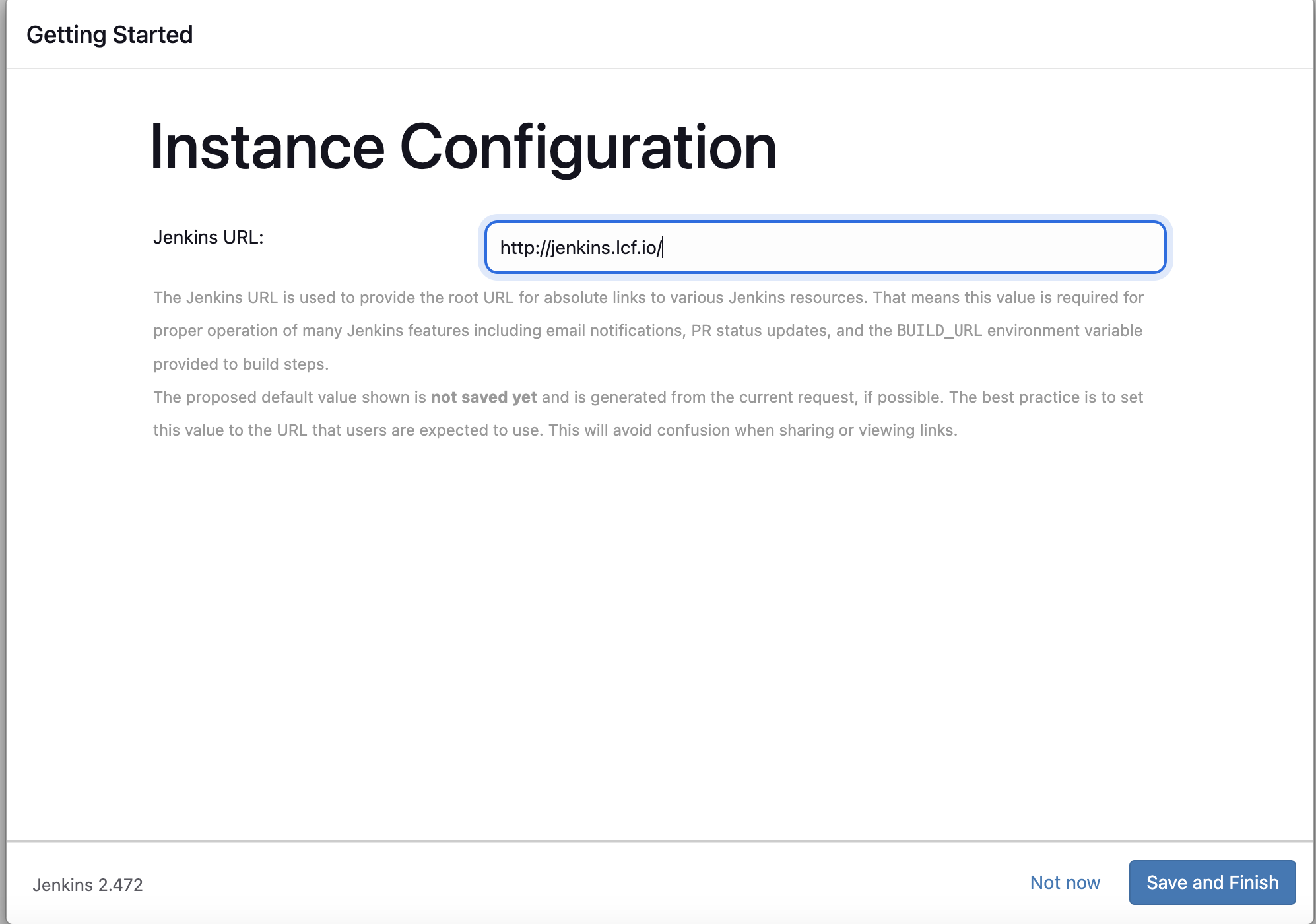 5 - Vérifier que Jenkins URL est bien positionné à jenkins.lcf.io puis cliquer sur Save and Finish