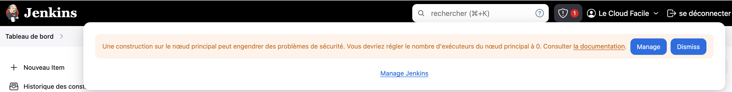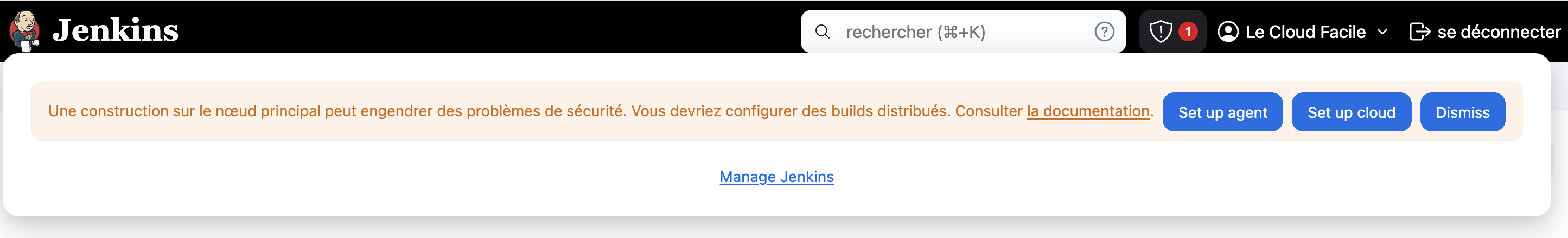 Jenkins recommande l'usage d'agent pour des builds distribués. Nous pouvons voir sur le message en cliquant sur l'icone de sécurité (voir image suivante). La procédure ci-après permet de configurer un agent Docker.