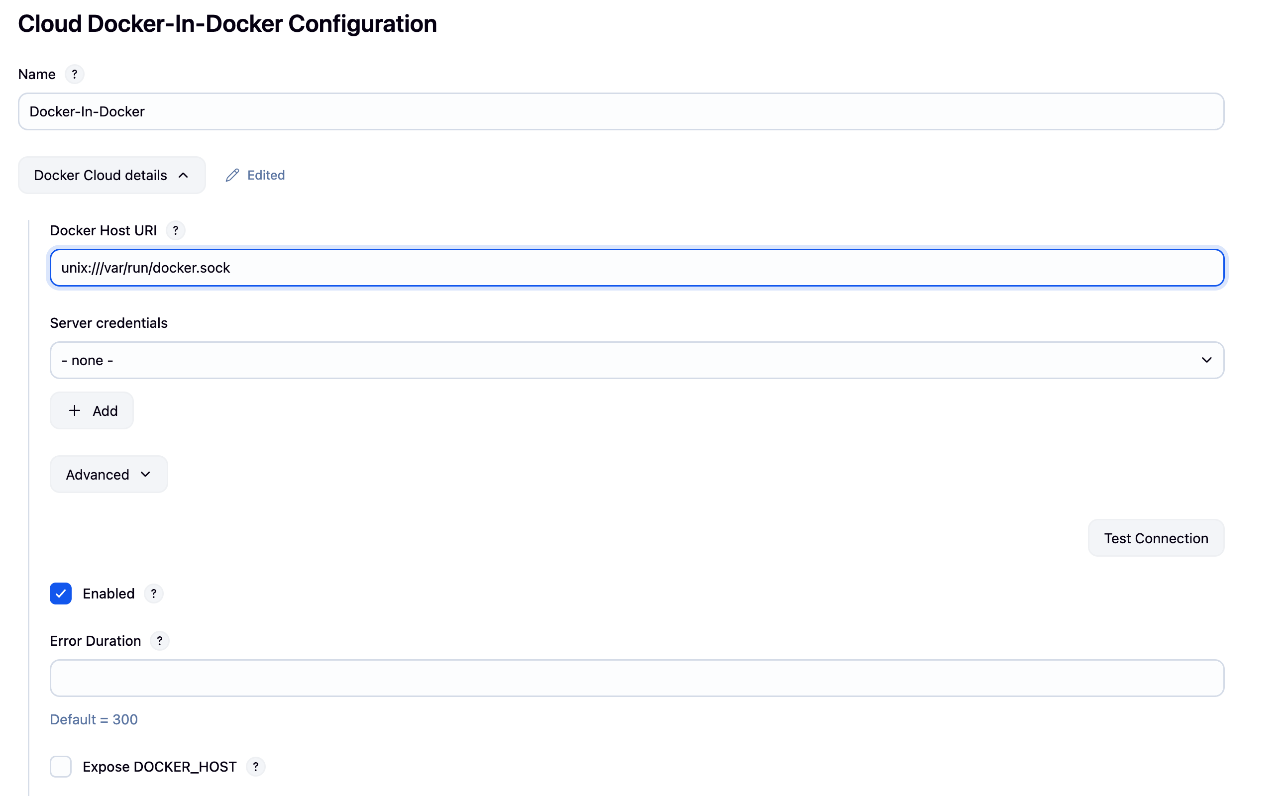 - Renseigner unix:///var/run/docker.sock dans Docker Host URI