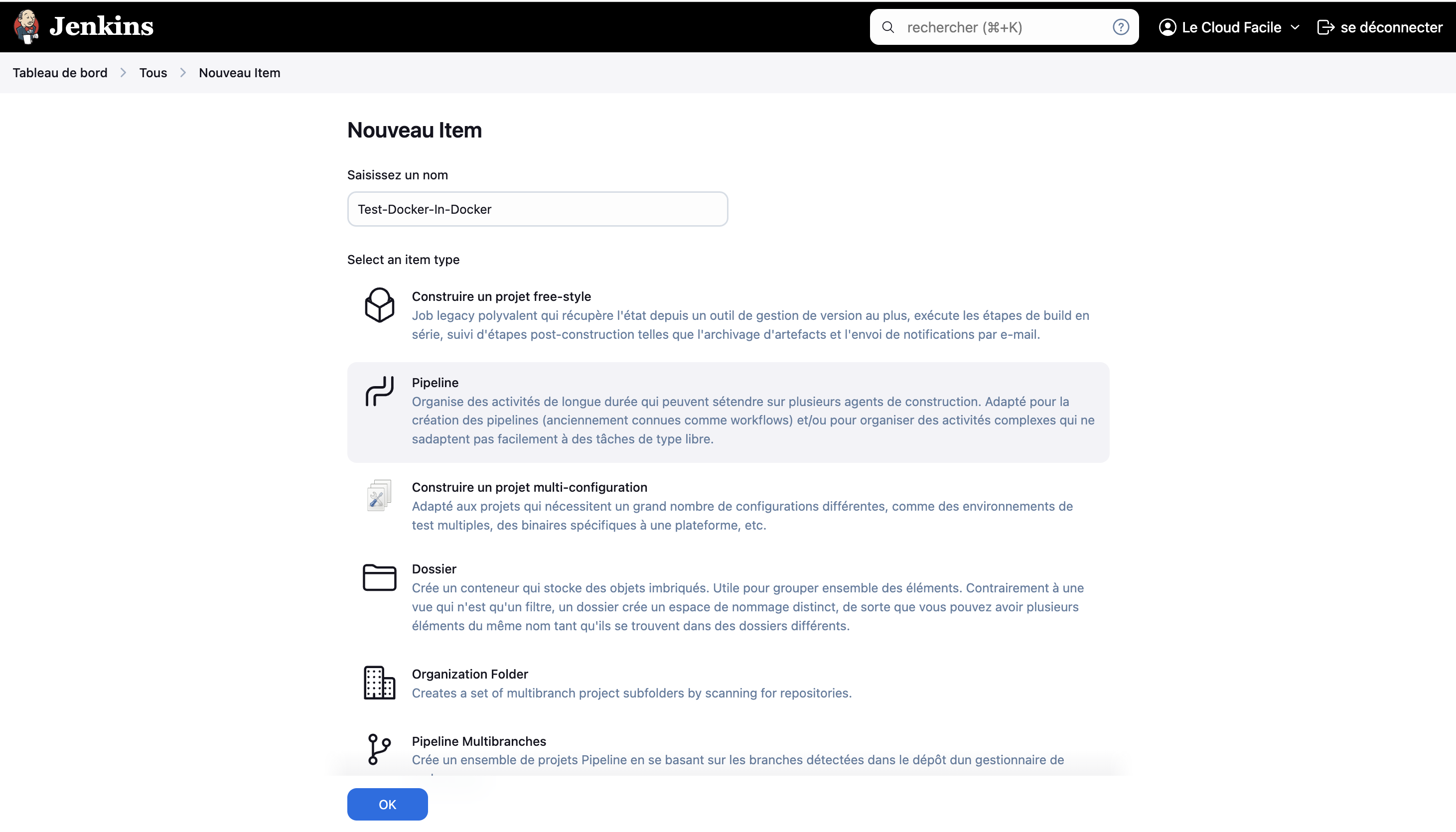 2- Renseigner le nom du pipeline Test Docker-In-Docker, selectionner Pipeline puis cliquer sur OK.
