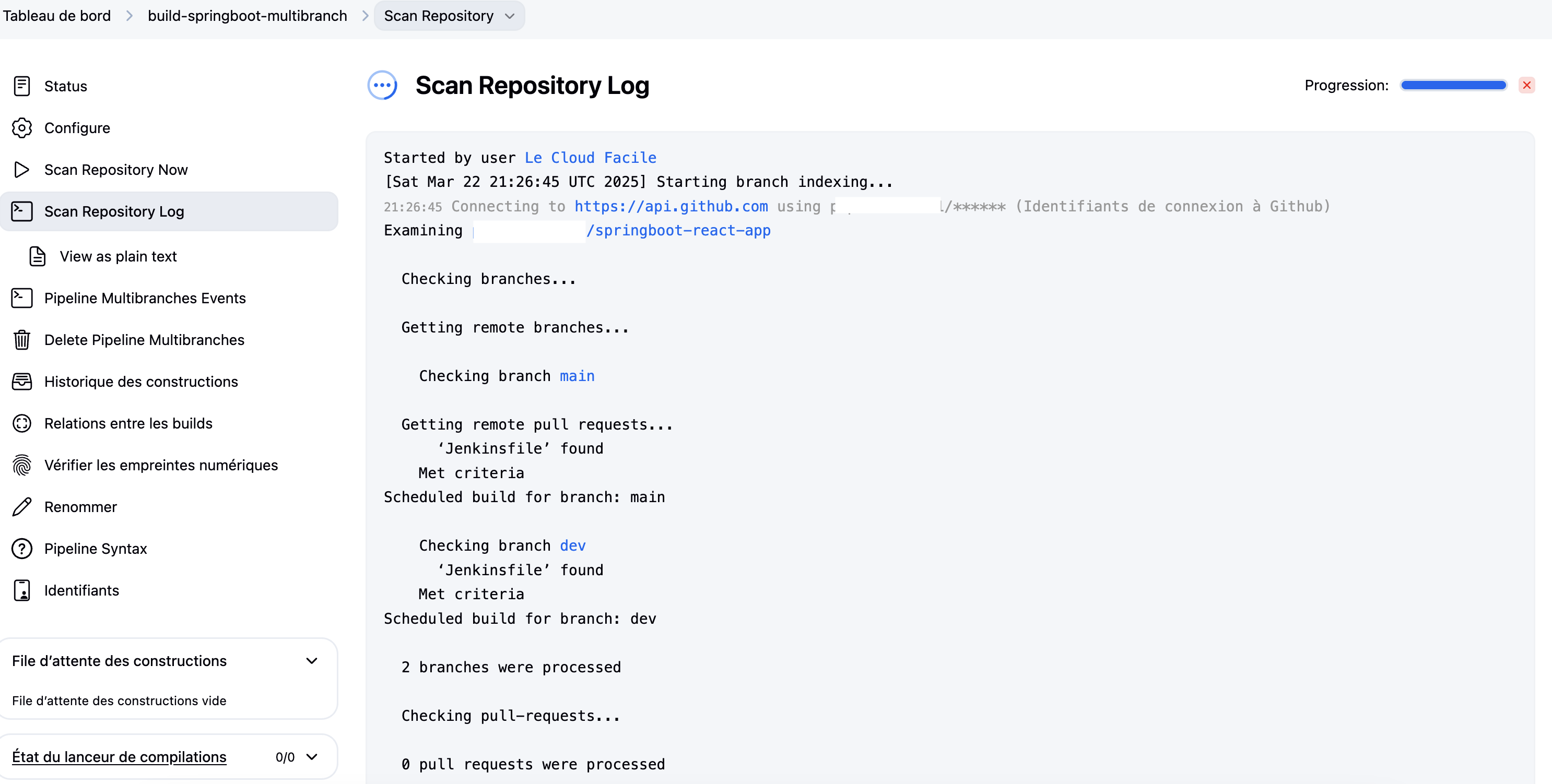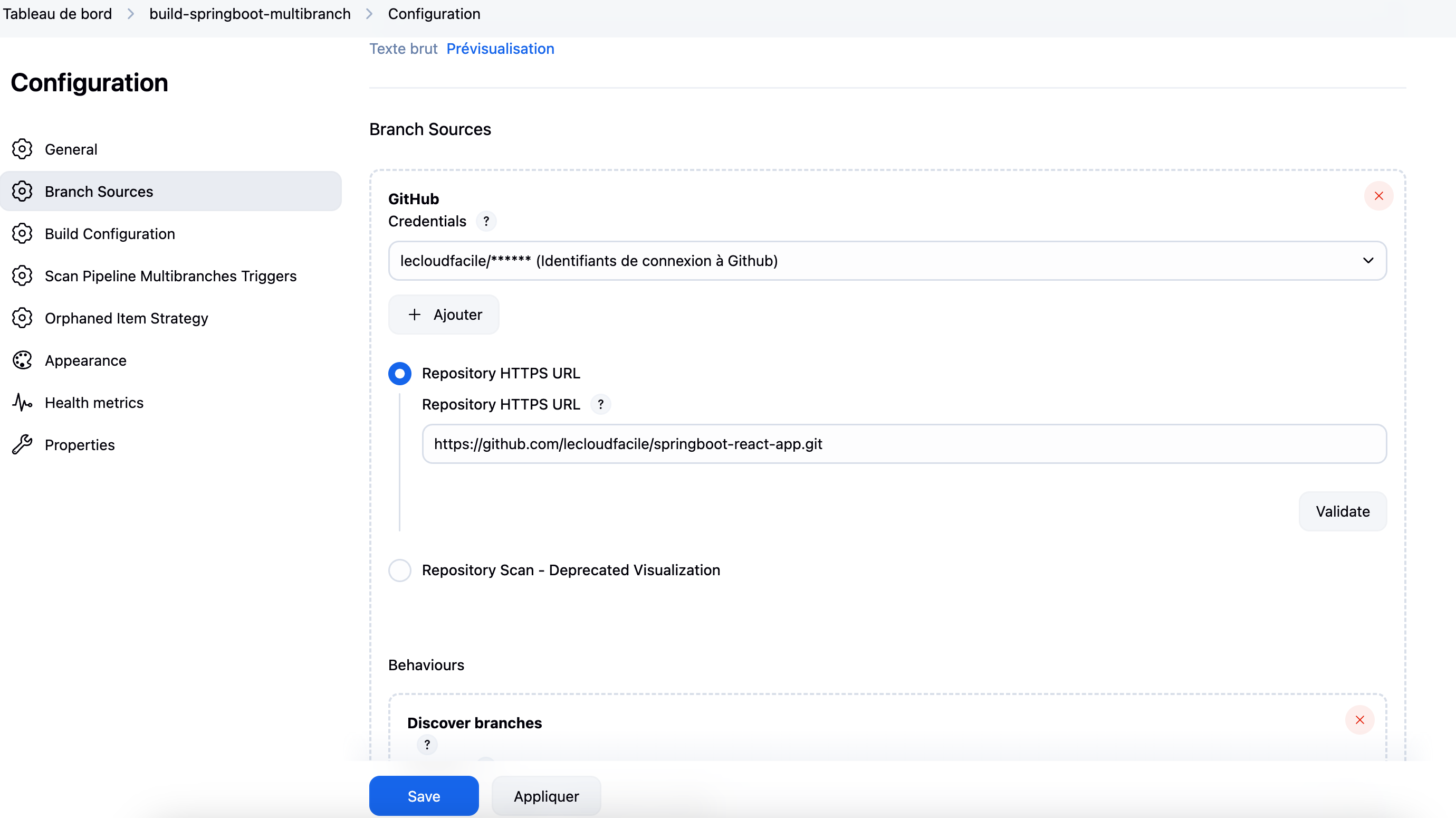 https://github.com/<username>/springboot-react-app.gitet sélectionner le credential de connexion à Github renseigné précèdemment