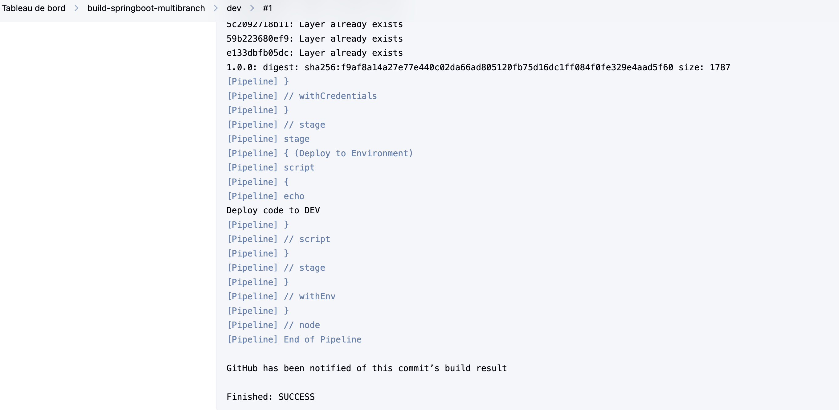 devet surconsole outputdu job lancé en dev, on peut voir le résultat de la sortie de notre stage de déploiement qui renvoie le résultatDeploy code to DEV.