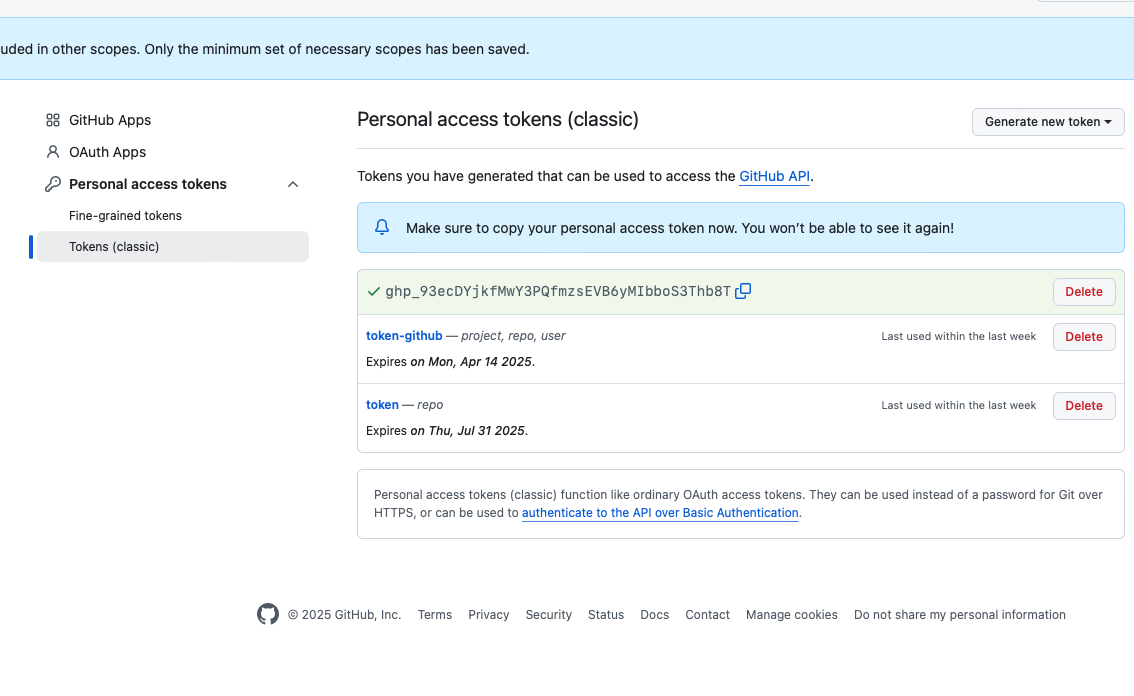 token-github, selectionner les scopes : repo, user et project, et cliquer surGenerate token