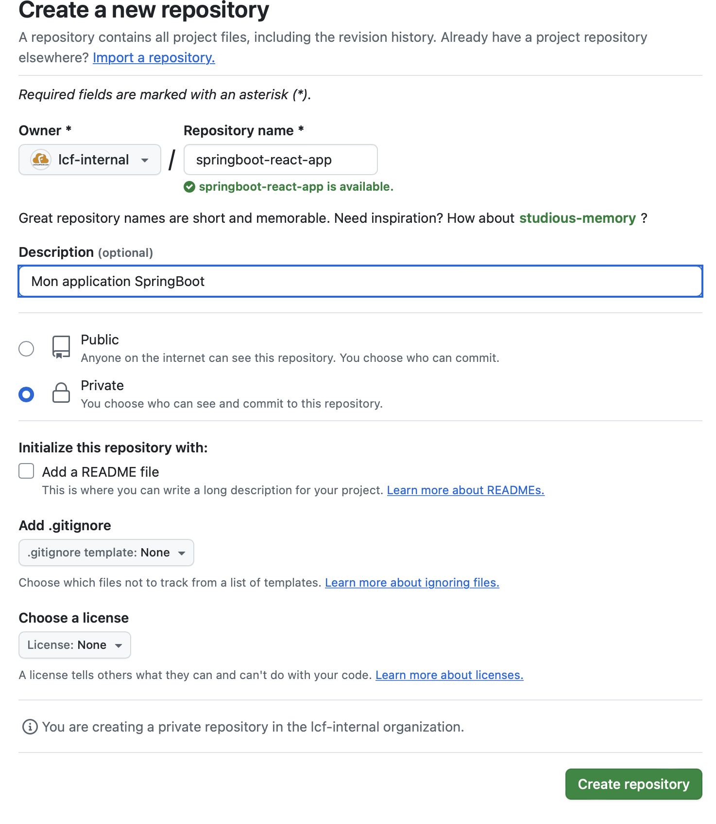Renseigner springboot-react-app dans Repository name, puis mettre la description Mon application Springbootet rendre le projet private