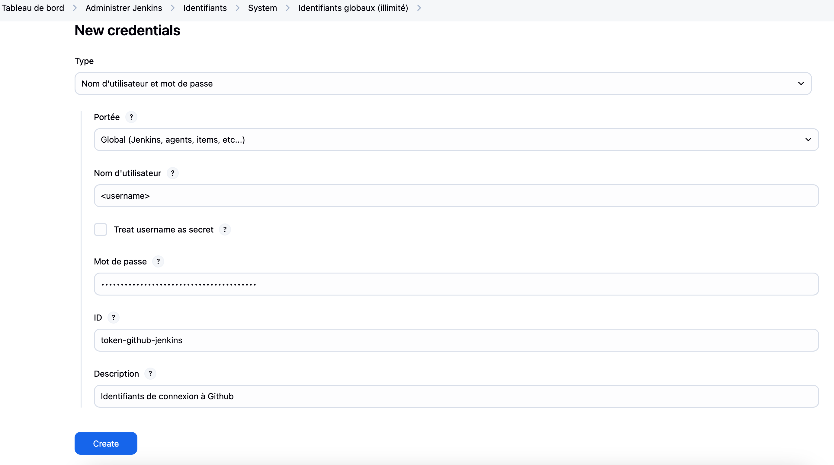 Comme durant le lab précèdent, on va renseigner, dans les credentials de Jenkins, le token Github généré précèdemment