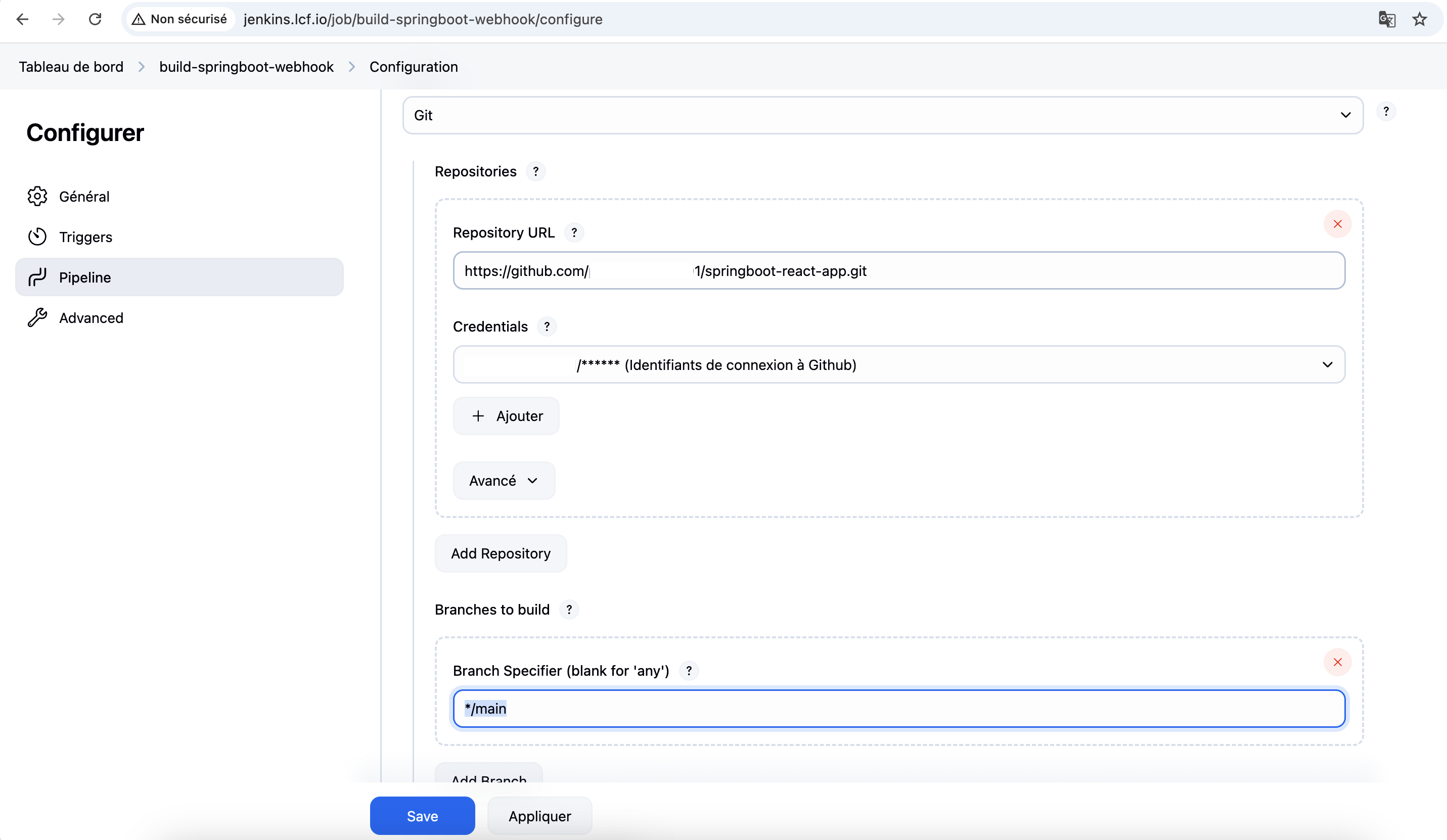 Pipeline, sélectionnerPipeline script from SCM, puis sélectionnerGit - Renseigner l'url du repo github et sélectionner le credential de connexion à Github