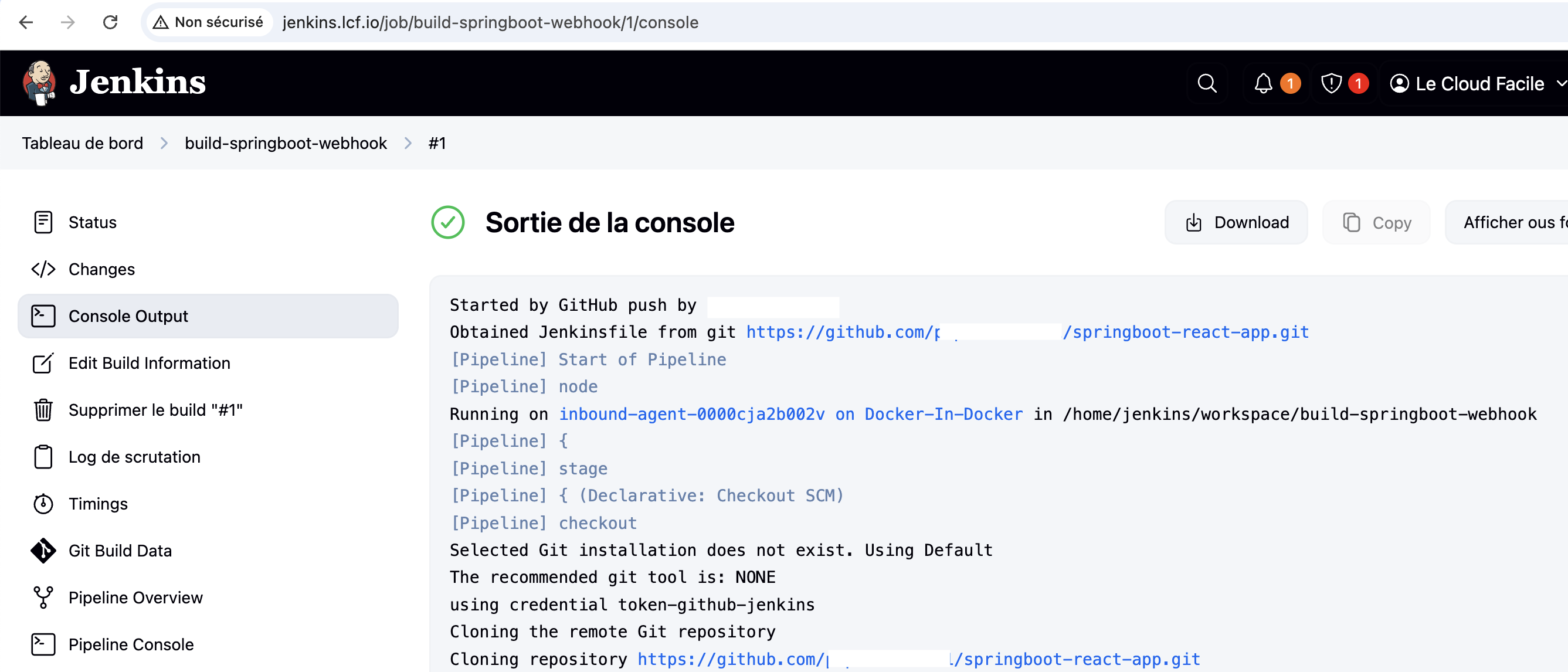 Console output, on peut voir que le job a été déclenché suite à un push depuis Github