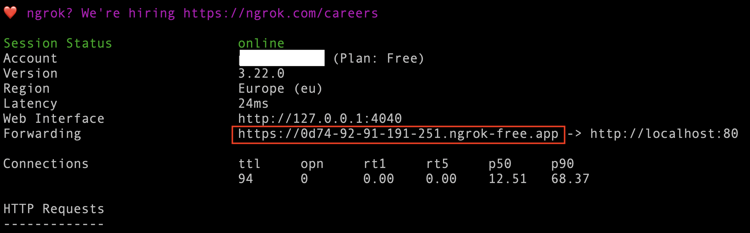 - Démarrer ngrok avec la commande ci-dessous qui va créer une url publique qui va rediriger tout le traffic vers notre localhost et sur le port 80