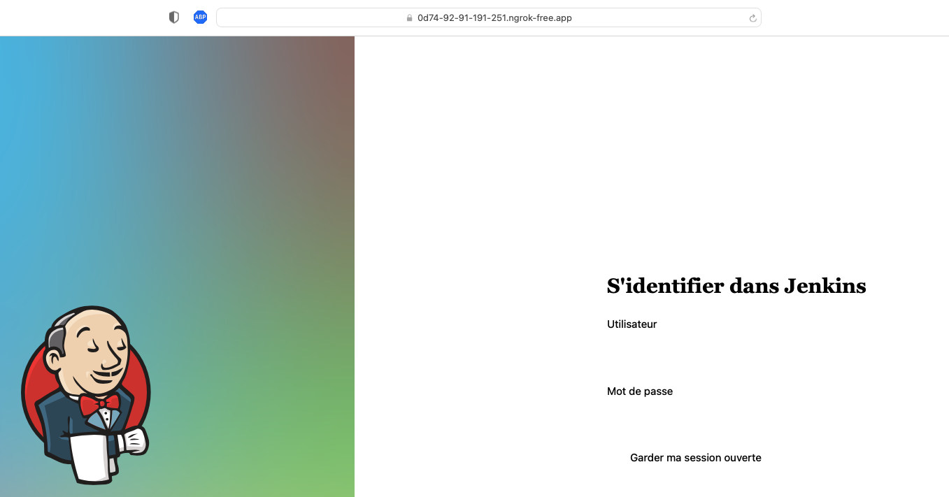 - Se rendre sur l'url ngrok https://0d74-92-91-191-251.ngrok-free.app/ et confirmer qu'il redirige bien sur jenkins