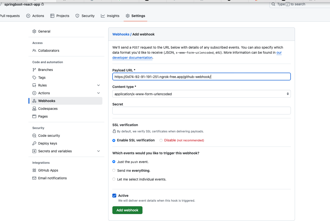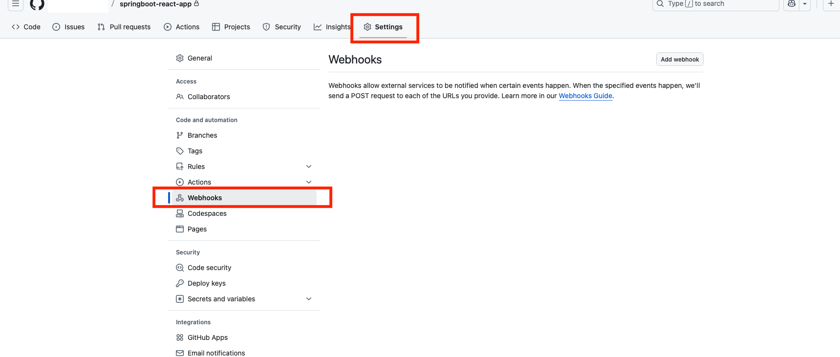 springboot-react-app, puis dans lesSettingsdu projet et cliquer surWebhooks