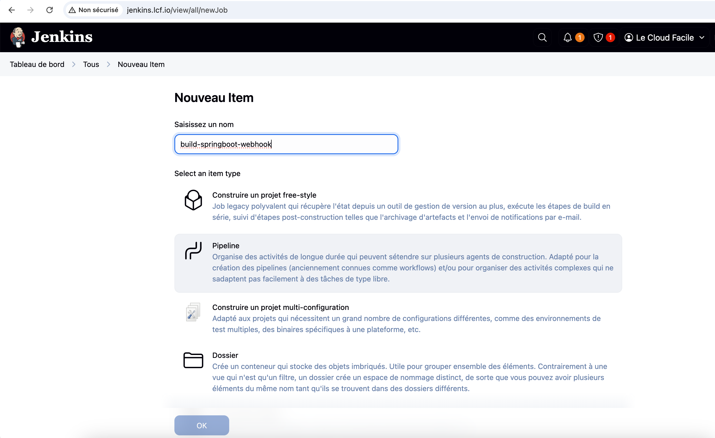 Dans cette étape on va créer un nouveau job de type pipeline qui se basera sur le repo Github sur lequel on vient de configurer le webhook