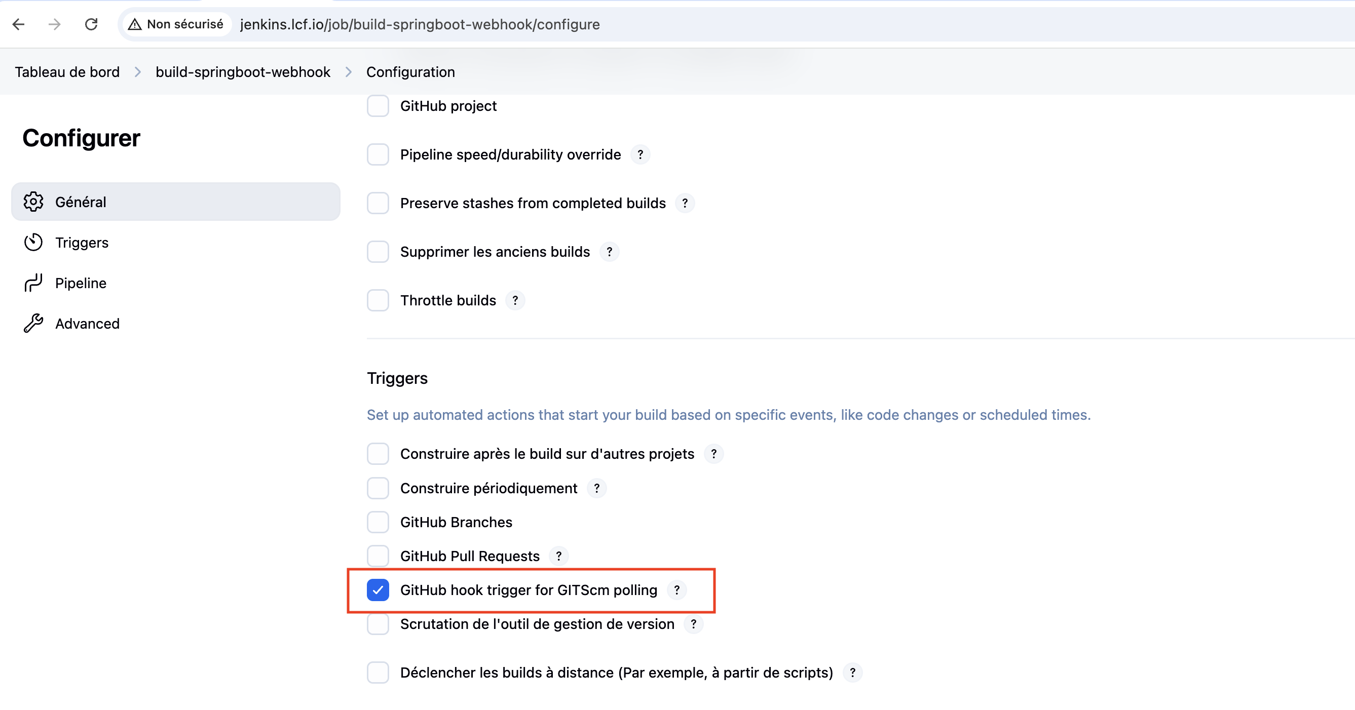 Triggers, sélectionnerGitHub hook trigger for GITScm polling