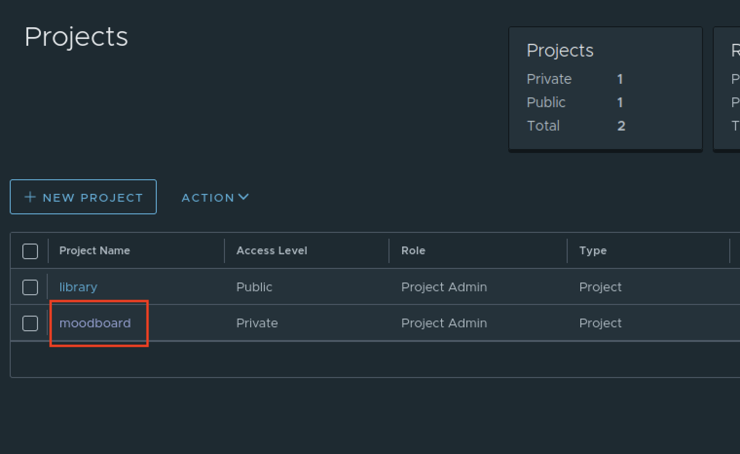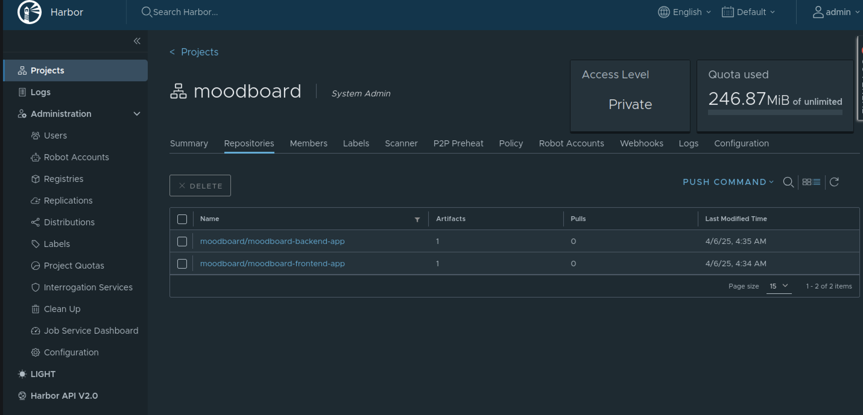 Se rendre sur harbor, puis dans le projet moodboard, on pourra constater les deux images poussés : backend et frontend