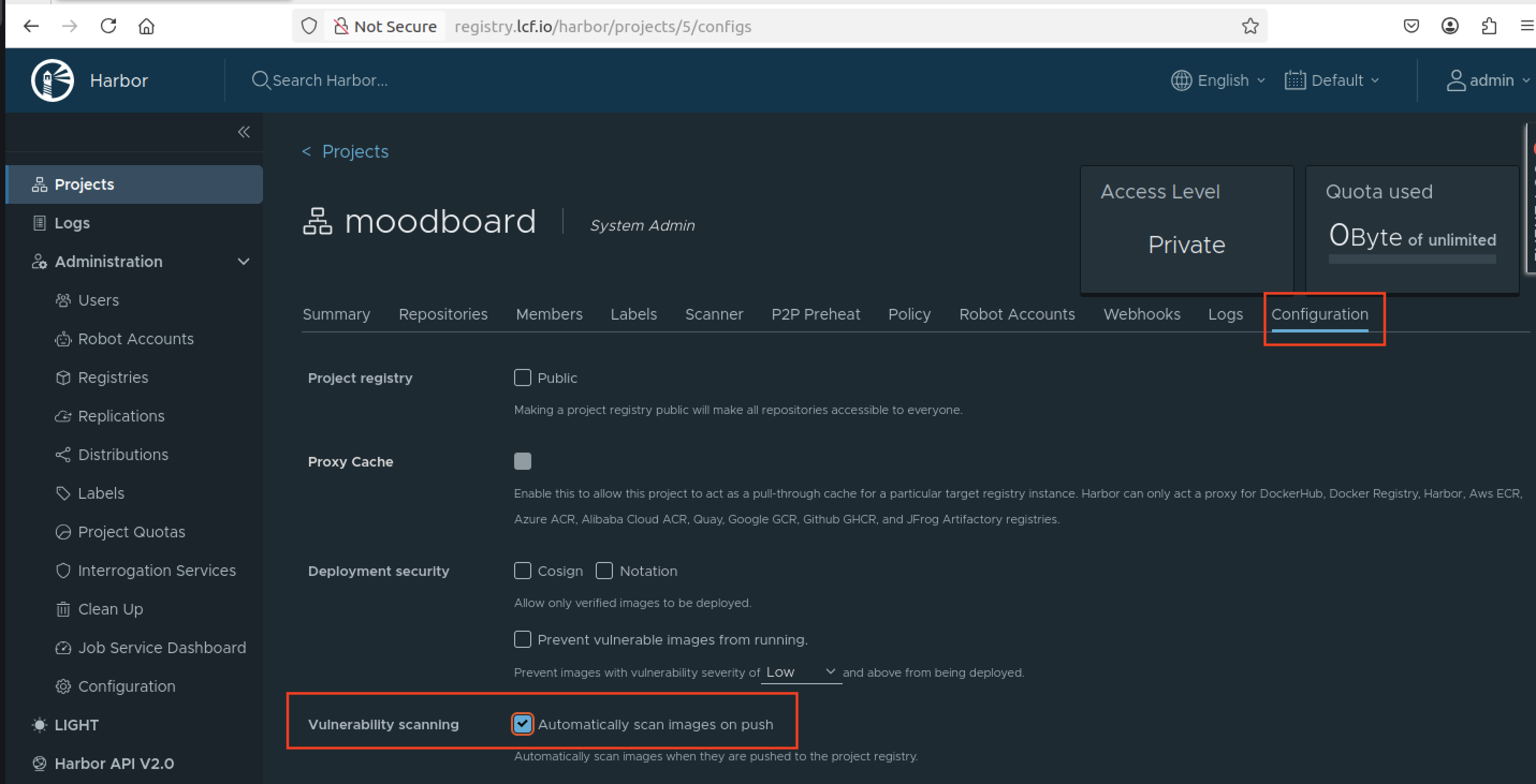 Puis se rendre dans configuration, cocher Automatically scan images on push et cliquer sur Save tout en bas.