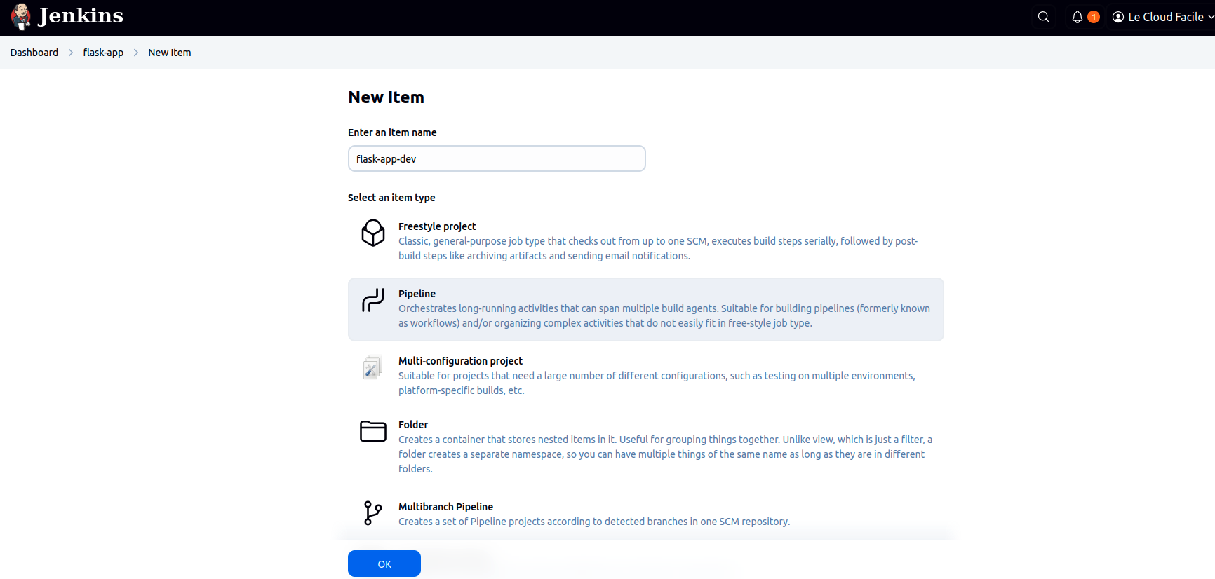 Dans cette étape on va créer deux jobs Jenkins de type pipeline pour accomplir la livraison continue de notre application flask-app :