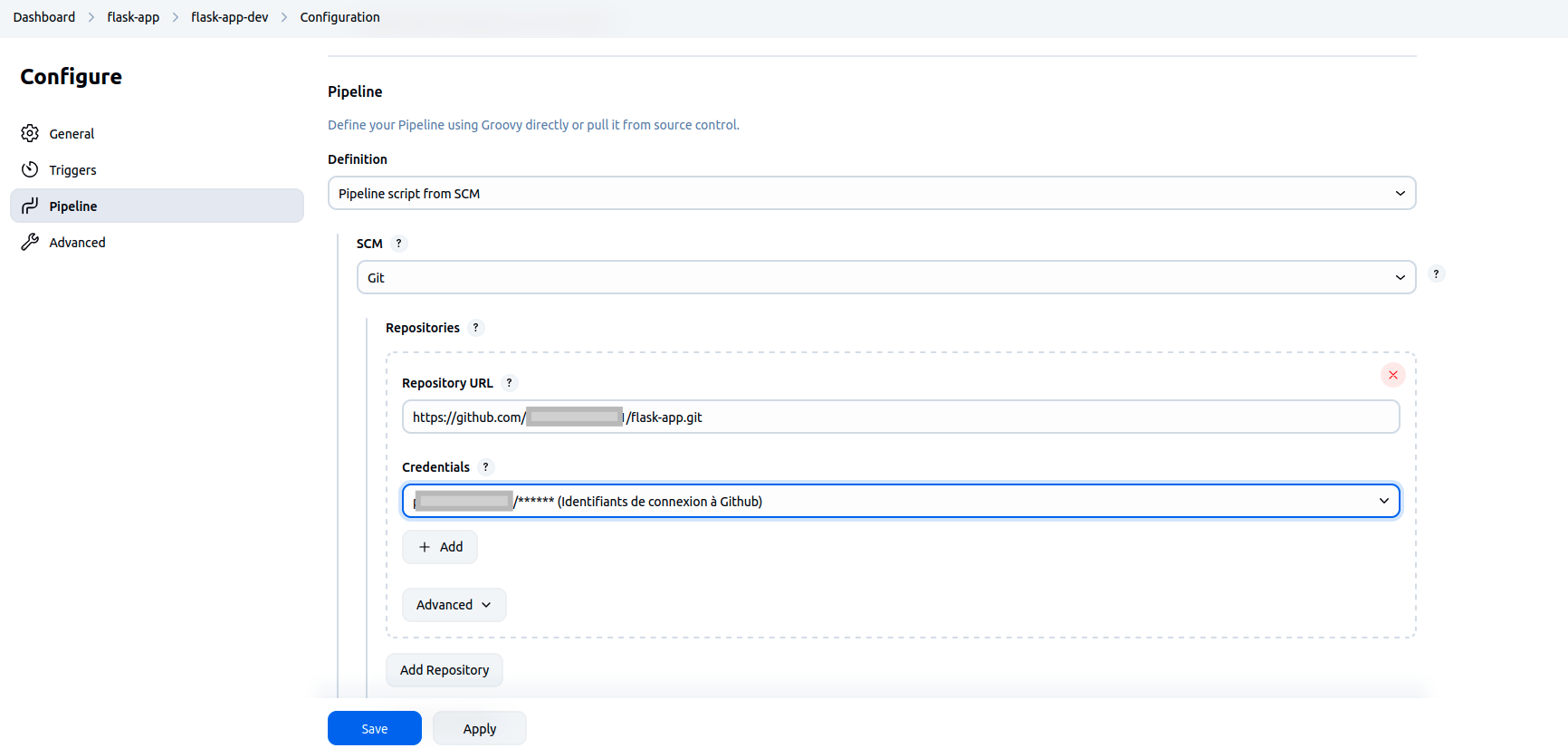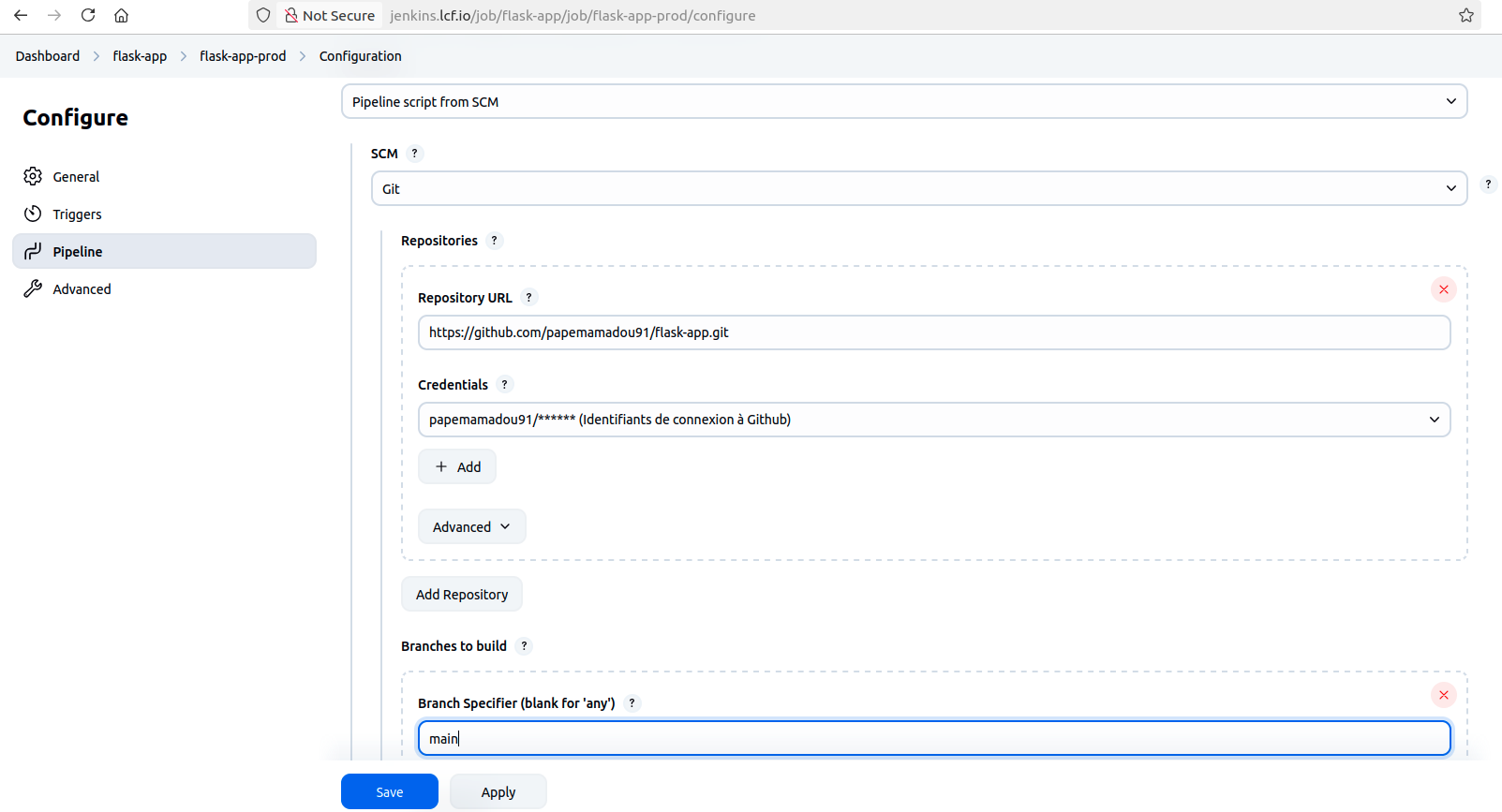 Dans la section pipeline, choisir Pipeline script from SCM, puis choisir Git. Ensuite renseigner l'url de votre repo Github hébergeant votre application flask-app et choisir le credential de connexion à Github comme fait lors des labs précèdents