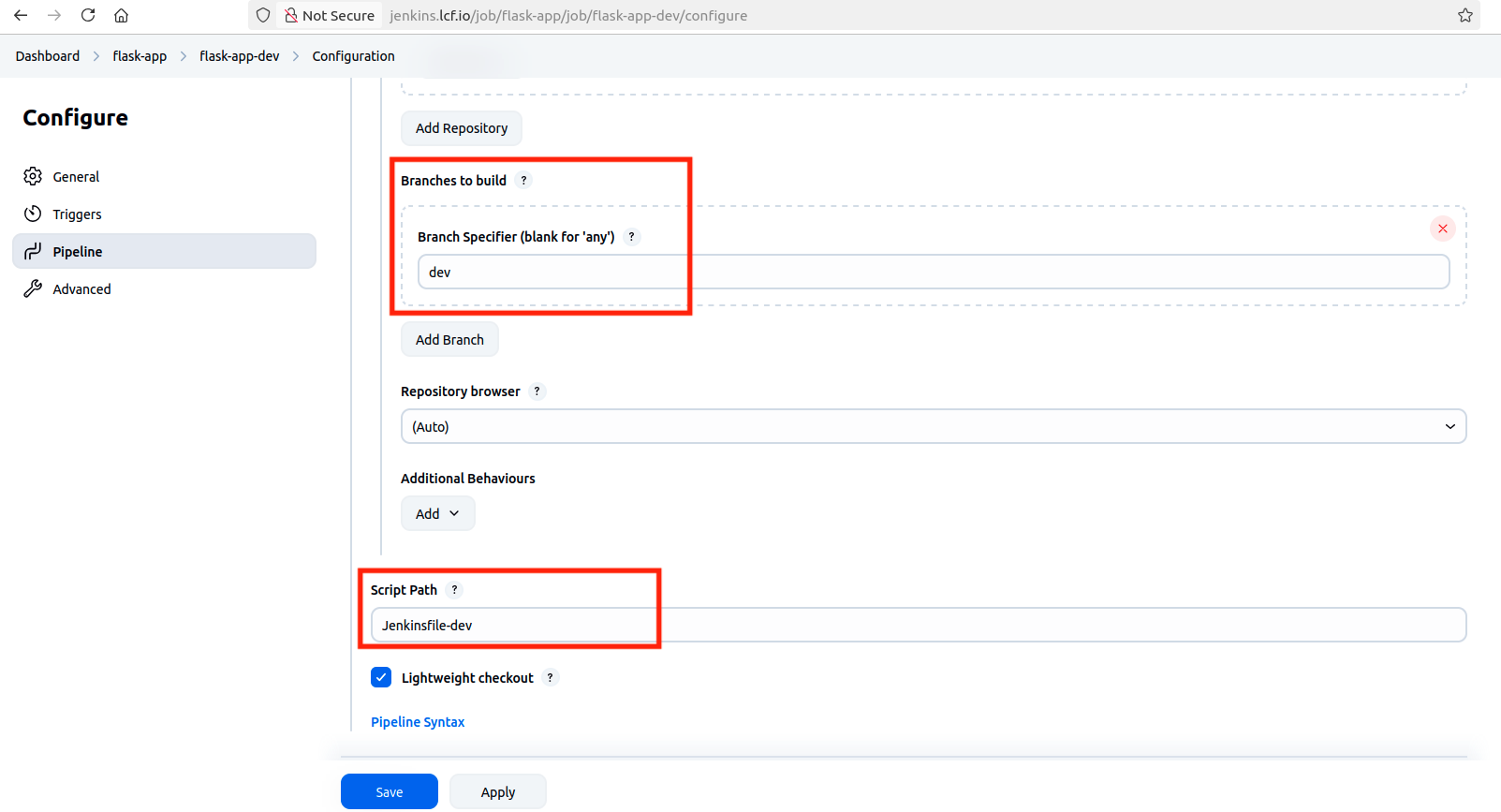 Renseigner dev dans la partie Branches to Build et enfin dans Script Path renseigner le nom donné à notre fichier jenkins de dev : Jenkinsfile-dev