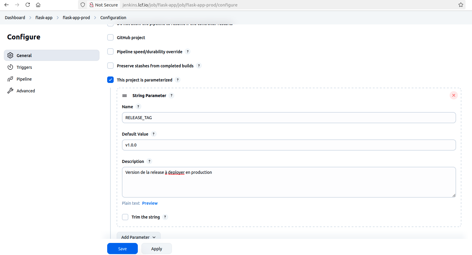 On va procèder maintenant à la création du pipeline de prod dans le meme dossier flask-app en suivant le meme procèdé que la dev hormis quelques petites adaptations en plus. Ce pipeline va nous permettre de déclencher manuellement le déploiement en production en lui renseignant le numéro de la release à déployer