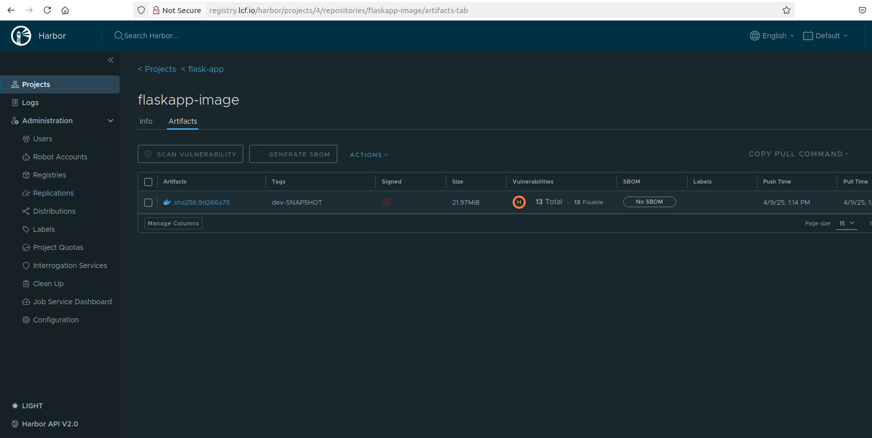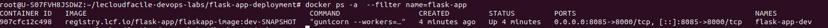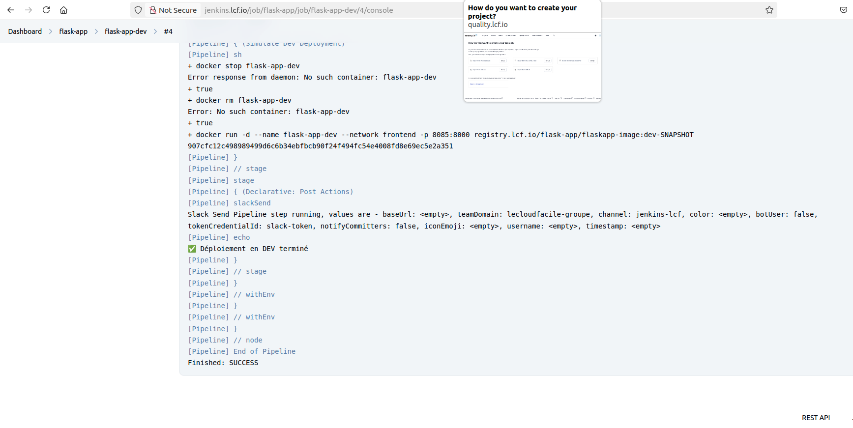 Vérifier que le job s'est terminé avec succès, que l'image Docker flaskapp-image avec le tag dev-snapshot est bien poussé sur harbor et que en local un conteneur du nom de flask-app-dev est bien lancé
