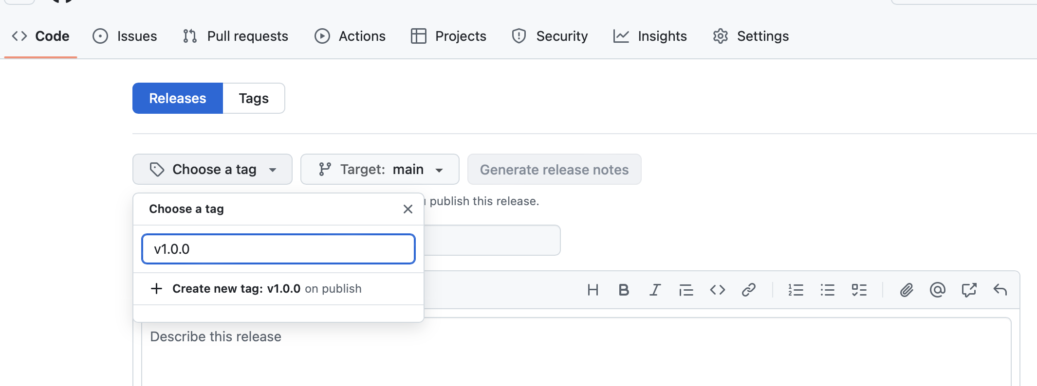 Ensuite cliquer sur Choose a tag , et renseigner v1.0.0