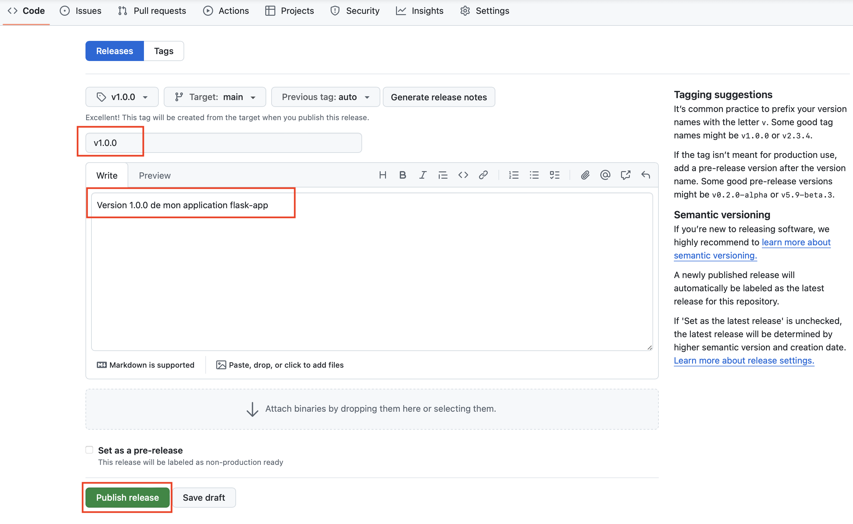 Ensuite renseigner les informations ci-dessous et cliquer sur Publish release