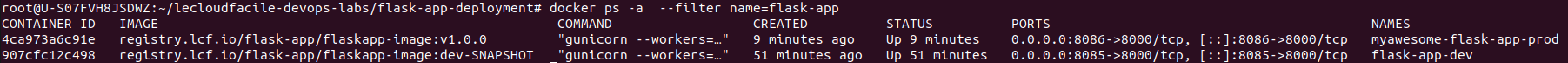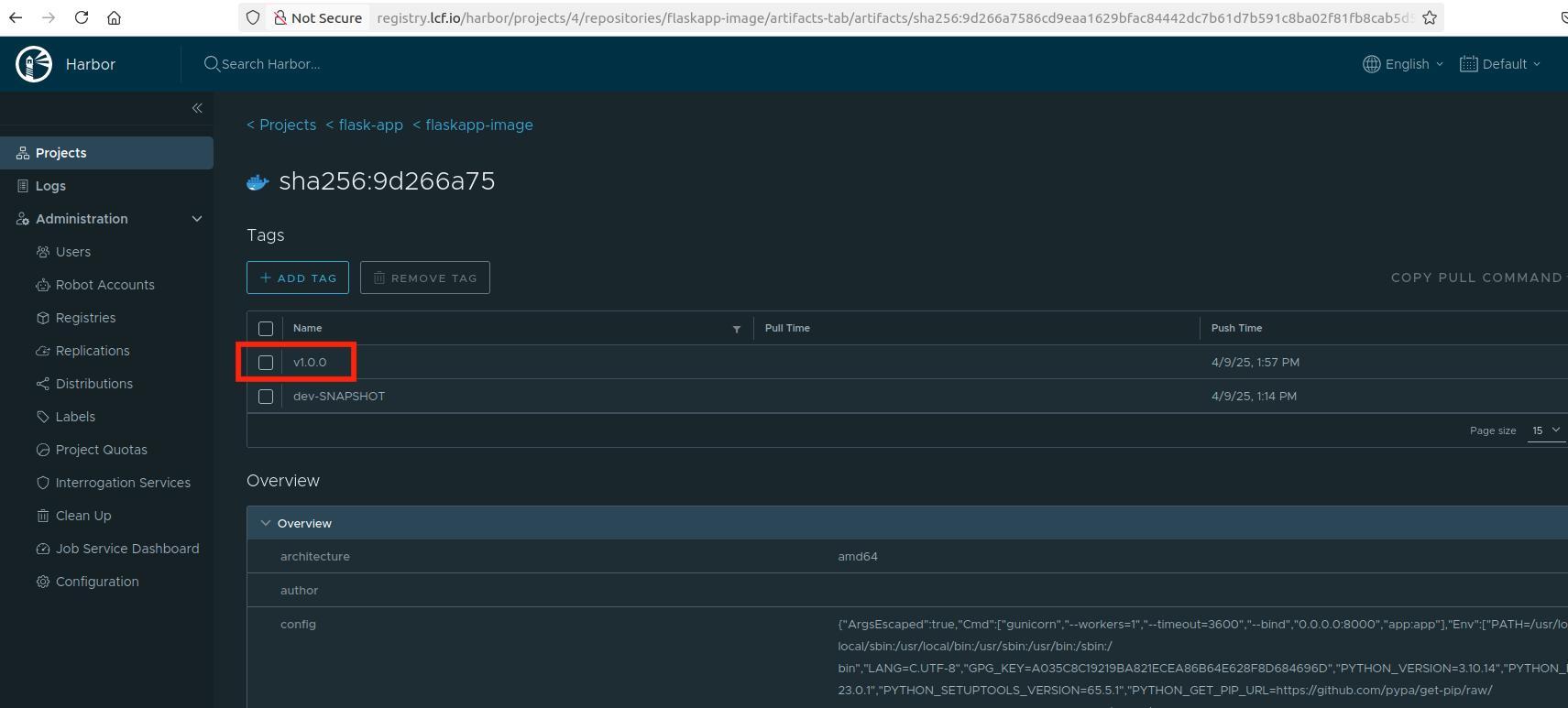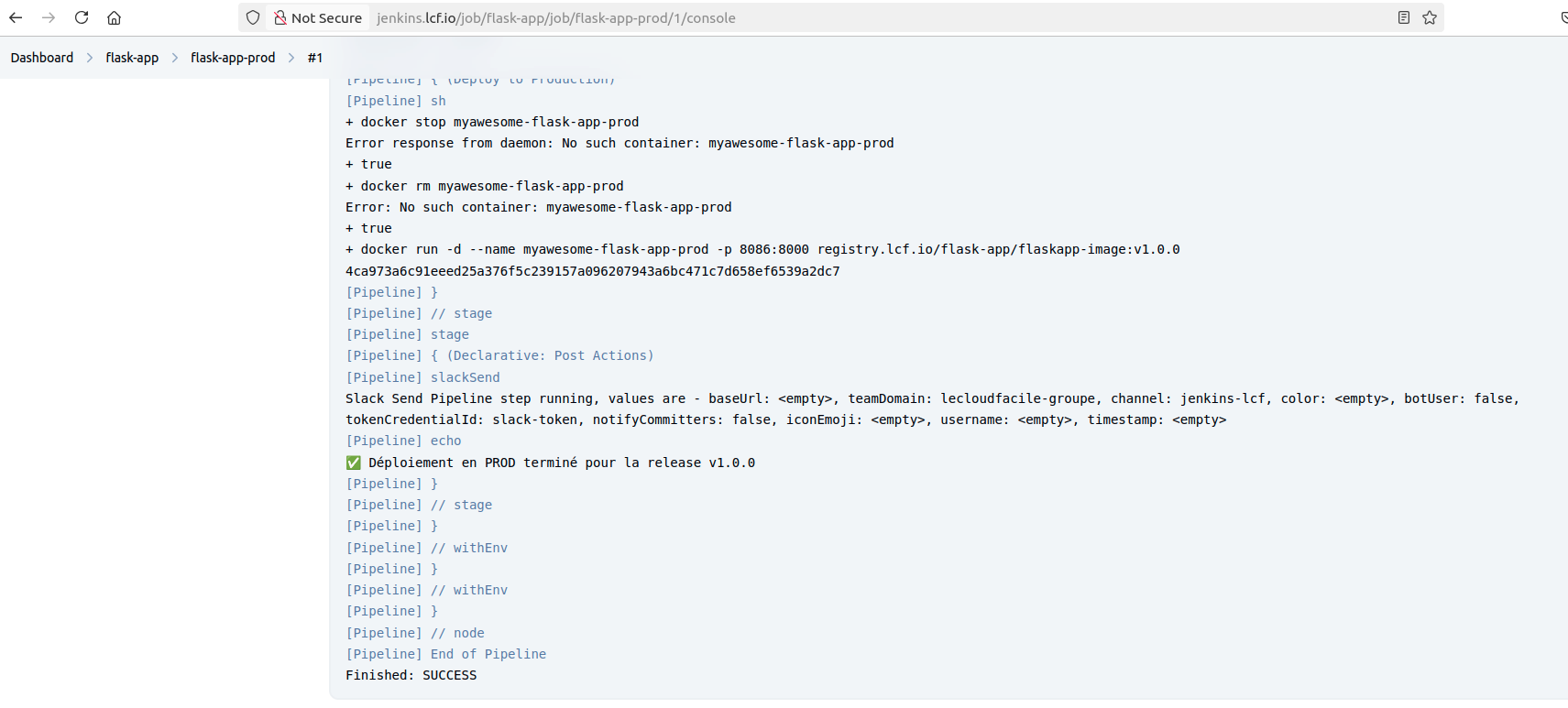 Vérifier que le job s'est terminé avec succès, que l'image Docker flaskapp-image avec le tag v1.0.0 est bien poussé sur harbor et que en local un conteneur du nom de flask-app-prod est bien lancé