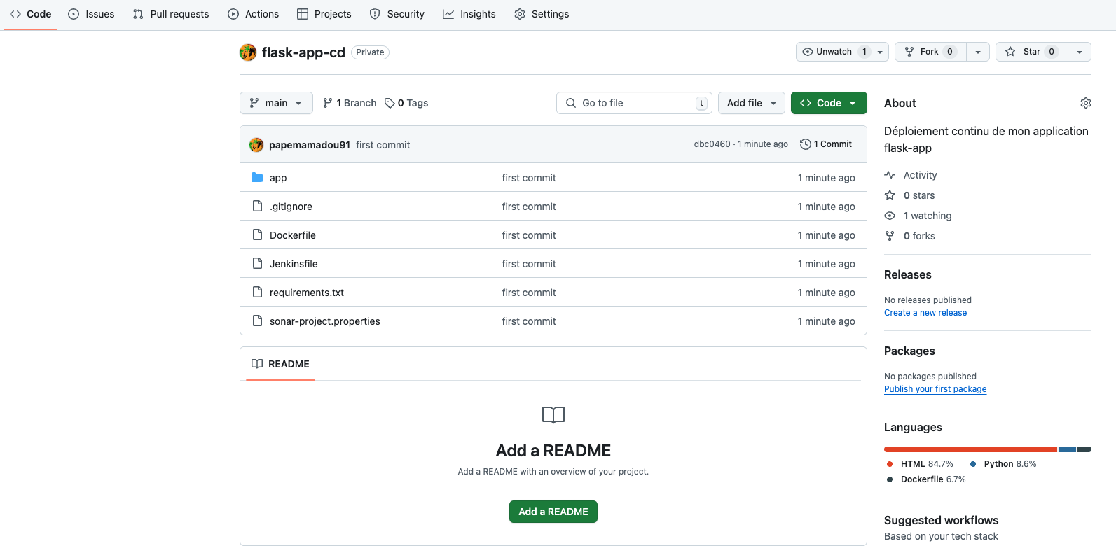 Etape 2 : Création d'un repo Github privé pour hébergement de l'application flask-app#