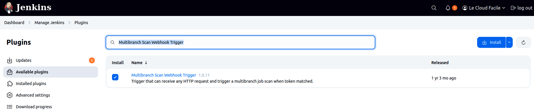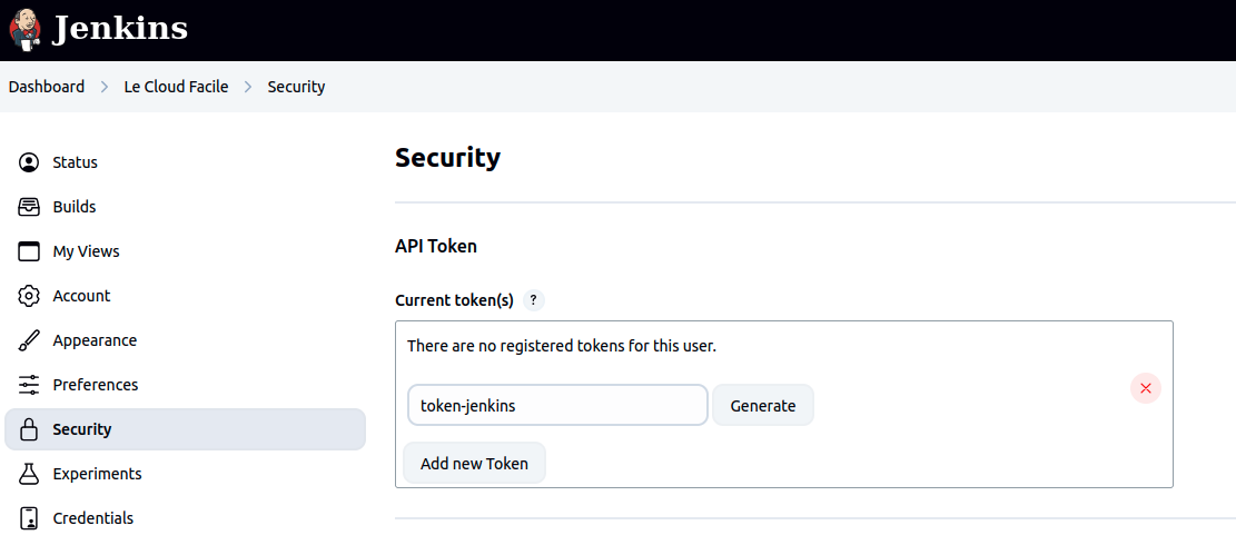 Dans cette étape on va génèrer un token pour l'utilisateur lecloudfacile sur Jenkins pour rendre possible le déclenchement automatique des étapes de livraison de notre application vers la prod depuis un tag (stage Trigger Deployment from Tag du Jenkinsfile)