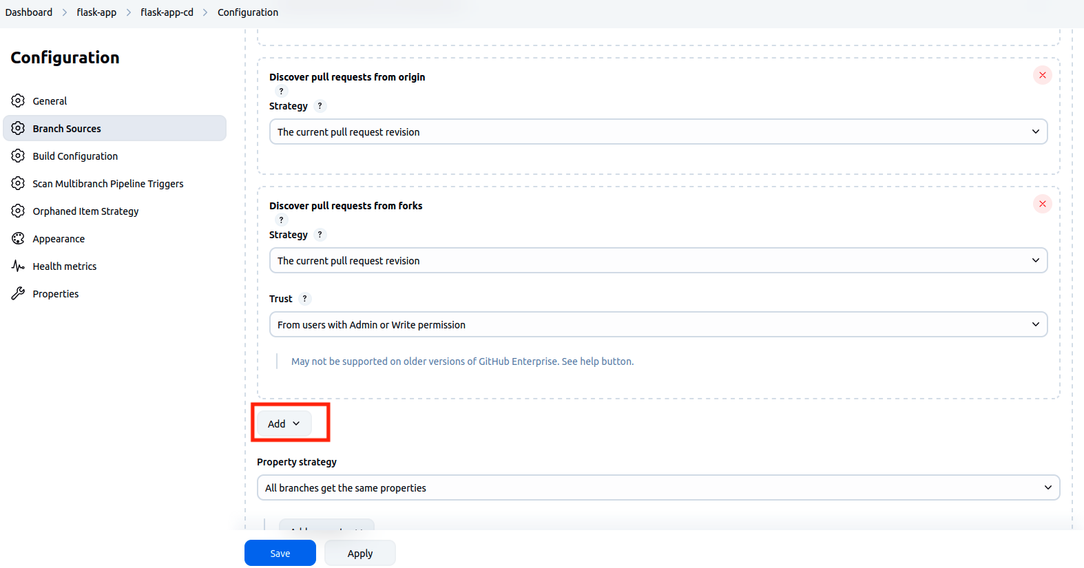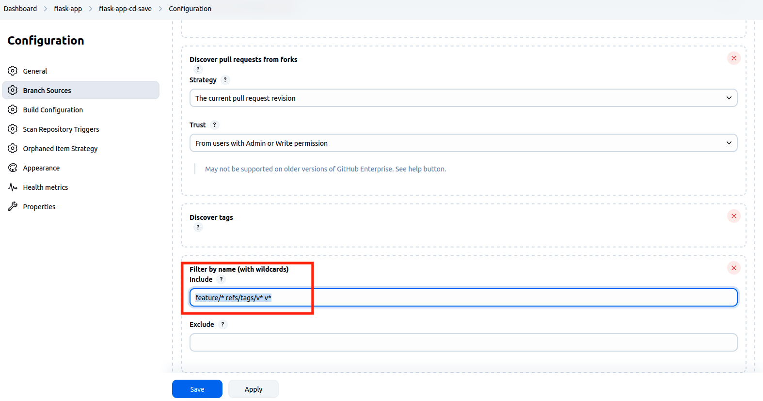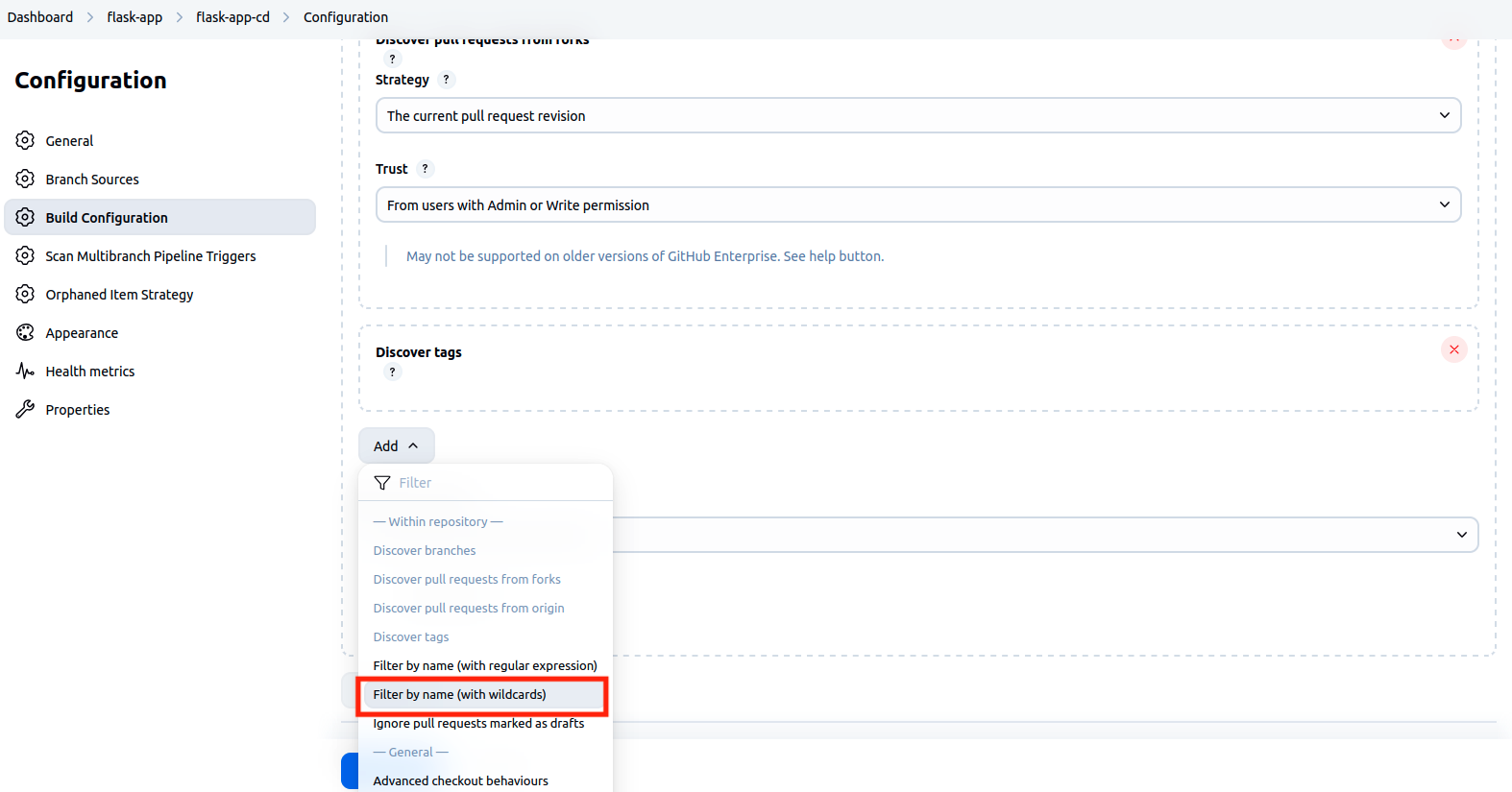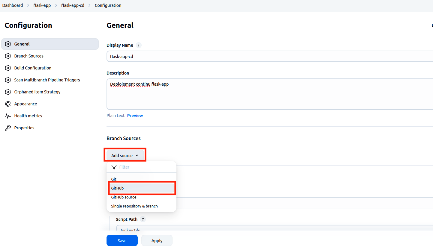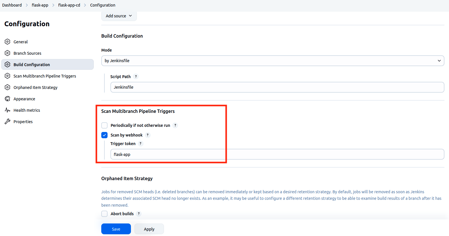 --> Dans la section Scan Multibranch Pipeline Triggers , cocher Scan by webhook et mettre la valeur flask-app dans le champ Trigger token
