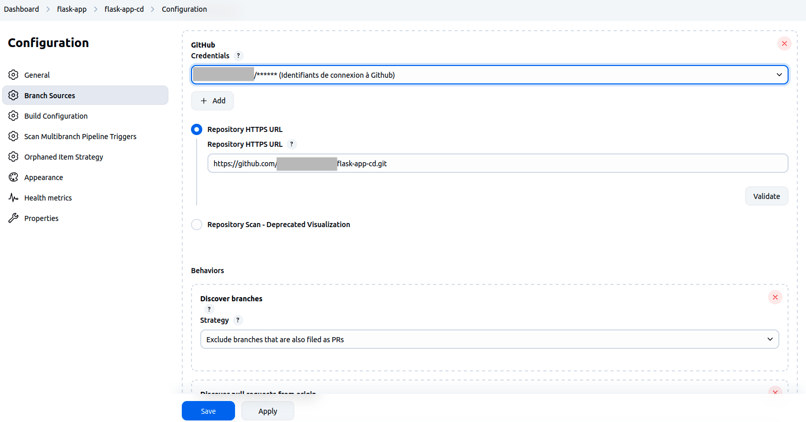 --> Renseigner l'url du repo github flask-app-cd et le credential de connexion