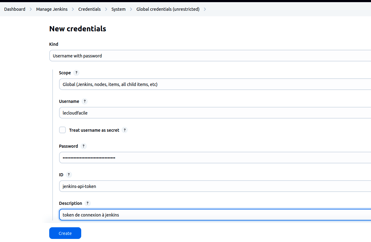 Etape 4 : Création du credential de Jenkins API token#