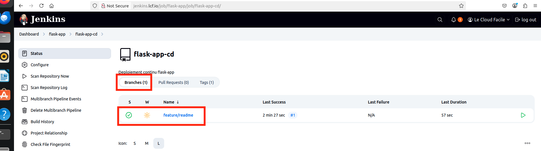 feature/readmeest visible depuis le pipeline multibranch et est bien en succès. Il constitue nos étapes d'intégration continue et de livraison vers l'environnement de DEV.
