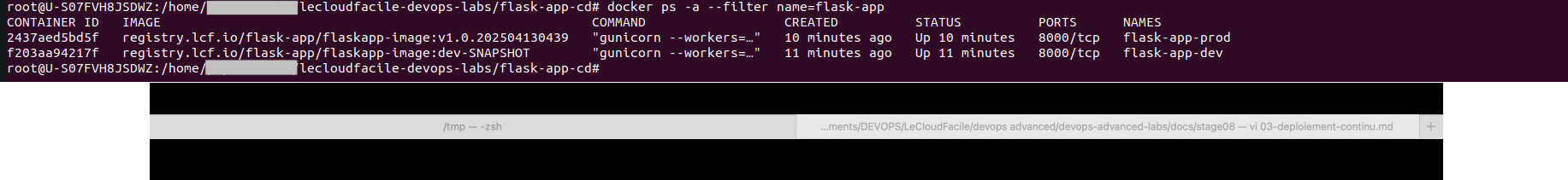 - Vérifier en ligne de terminal qu'on a nos deux conteneurs de dev et prod qui tournent avec les bonnes images Docker