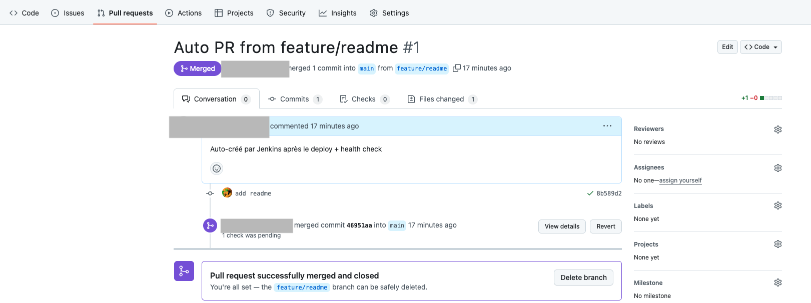 - Vérifier sur Github également qu'on a bien le pull request de créé et mergé avec le main
