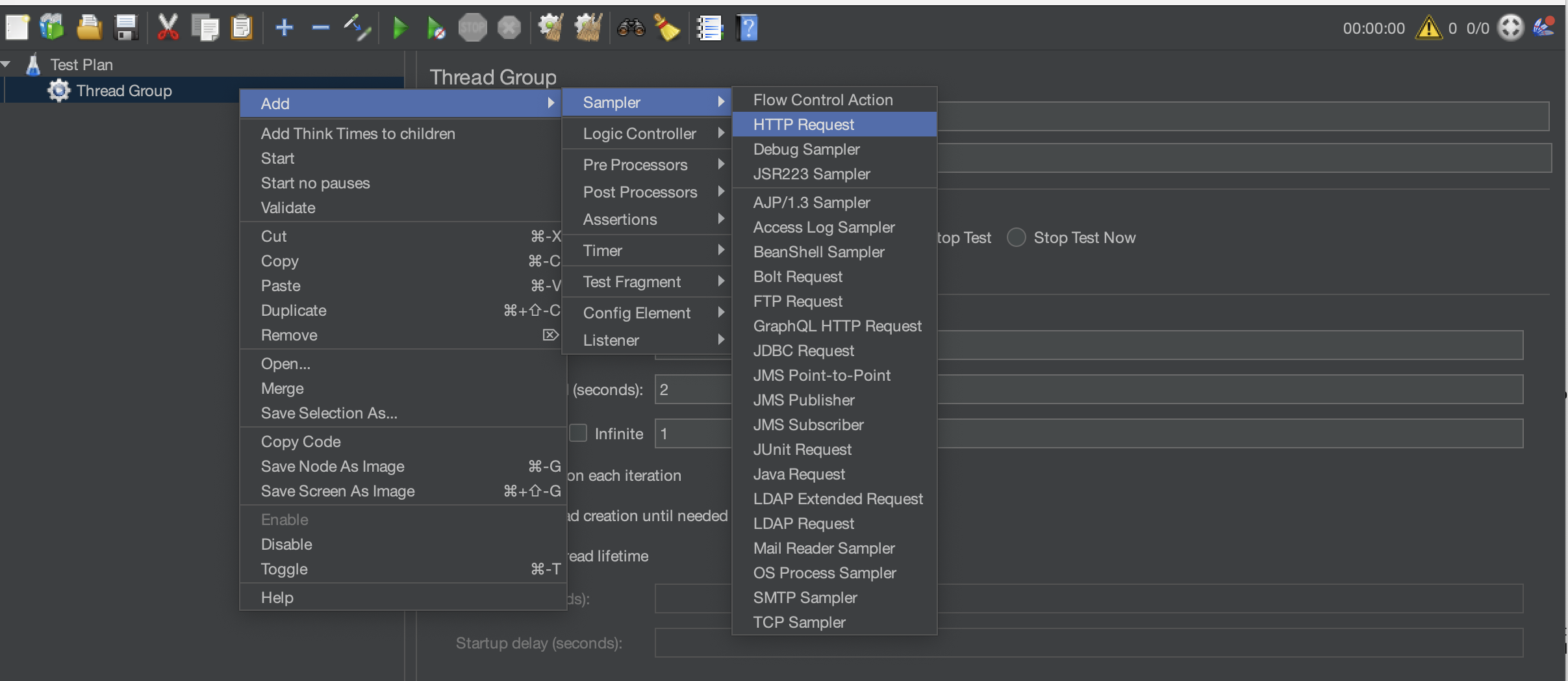 Clic-droit sur Thread Group -> Add -> Sampler -> HTTP Request