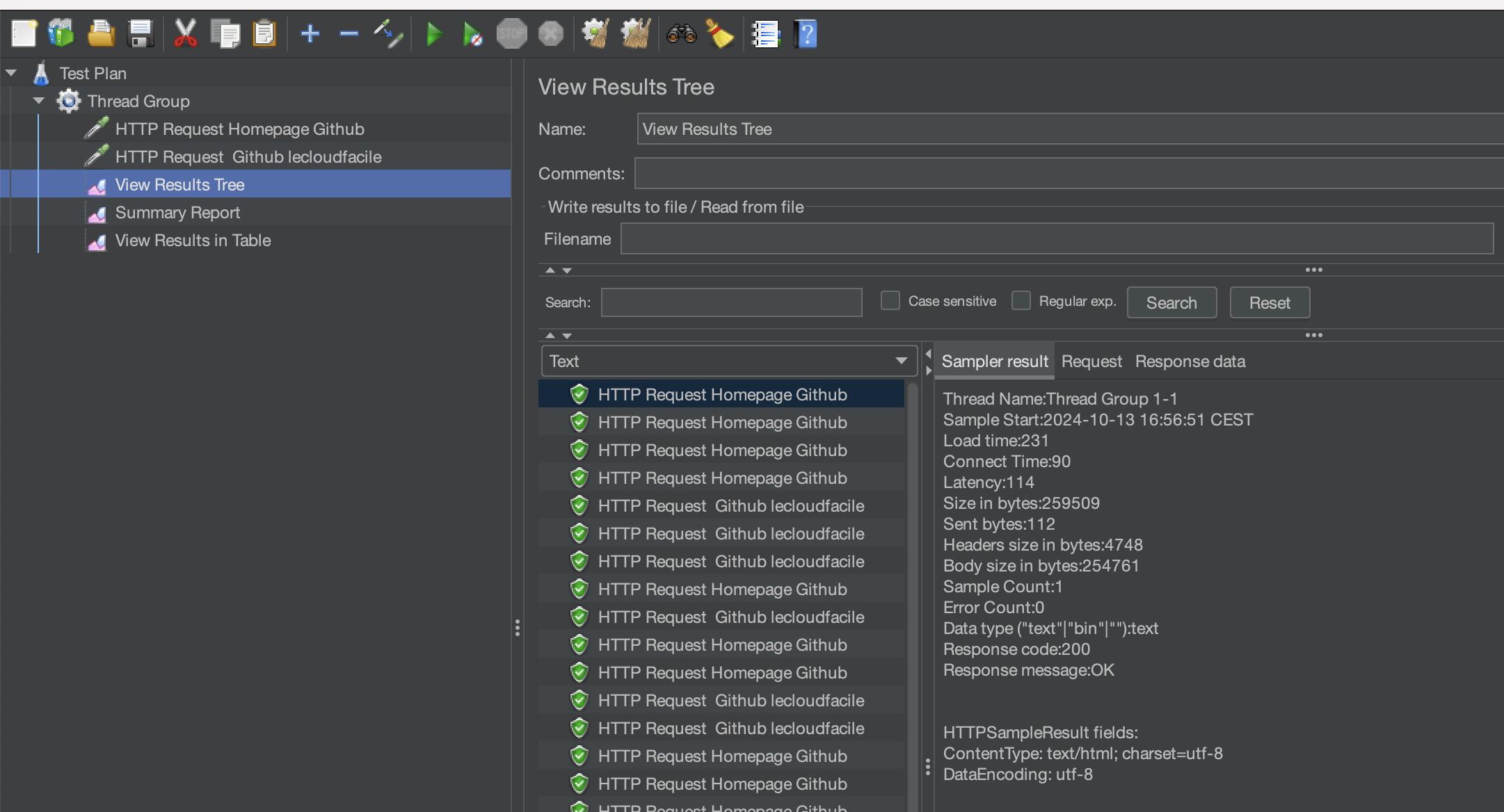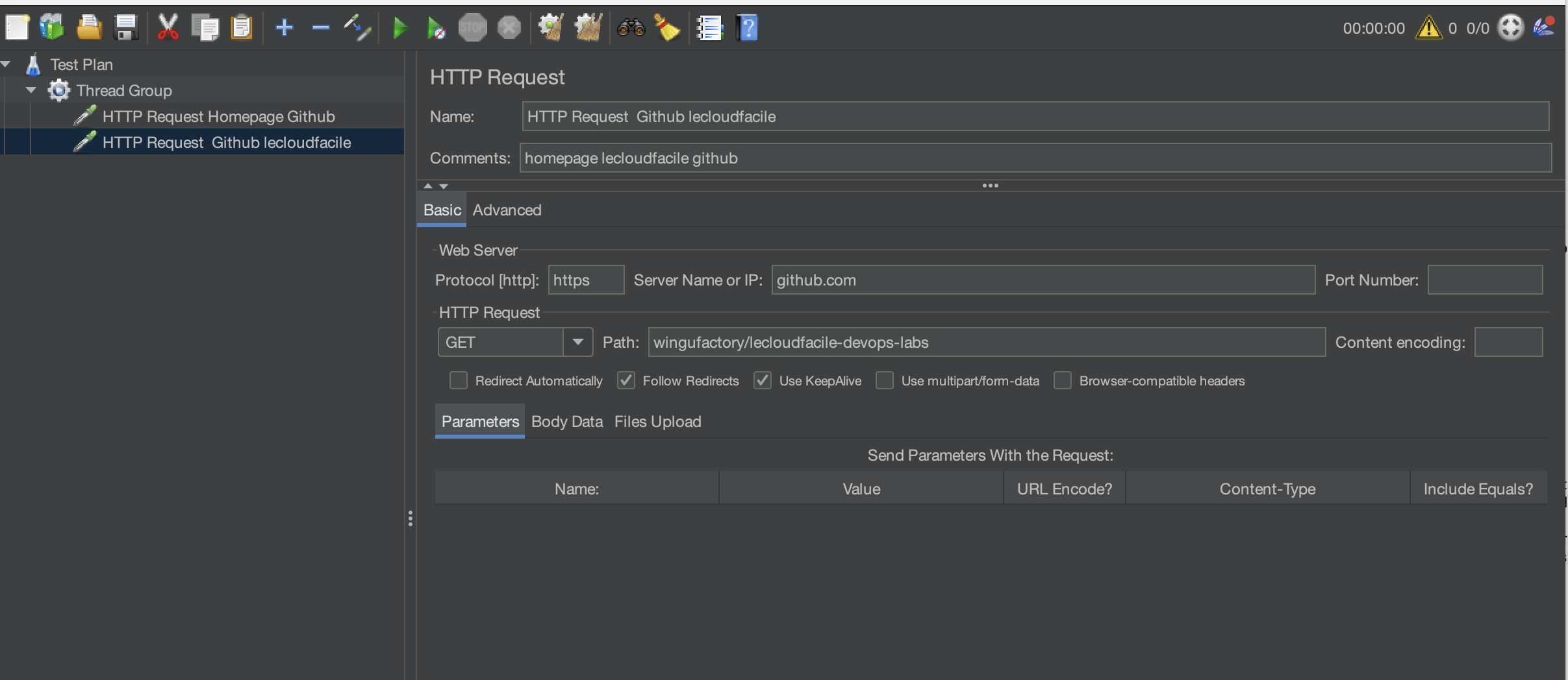 On peut rajouter un autre sampler de requête HTTP pour aller faire un stress test sur la page contenant nos labs (wingufactory/lecloudfacile-devops-labs) avec les infos ci-dessous :