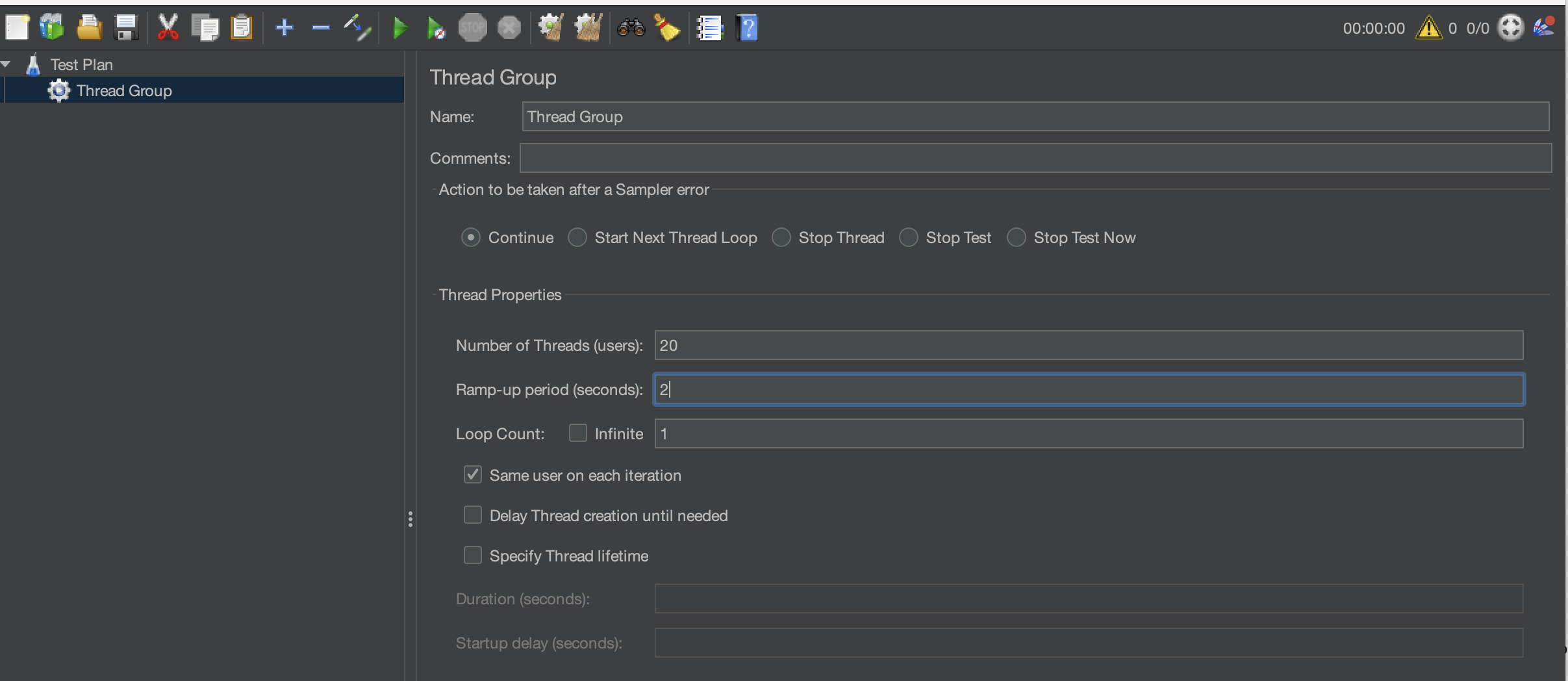 ramp-up period(seconds)=2 : nombre de secondes que nos 20 utilisateurs vont passer pour rentrer dans le système (durée de montée de charge). Supposons que les applications que nous proposons dans notre test doivent être testées pour 10000 utilisateurs. Il n'est pas très réaliste de laisser les 10000 utilisateurs entrer dans le système en même temps. Le temps de montée en puissance détermine le nombre de secondes pendant lesquelles 10000 utilisateurs seront inclus dans le système par l'outil de test. Dans notre exemple, la valeur de 2 secondes veut dire que nos 20 utilisateurs vont mettre 2s à rentrer dans le système (donc vont effectuer une action sur le site cible à tester), ce qui fait qu'on aura 10 utilisareurs dans le système par seconde. si on n'avait mis le nombres de threads à 10000 et ramp-up à 20 secondes, Jmeter simulera 500 utilisateurs par seconde pour avoir 10000 utilisateurs actifs à la fin de ces 20 secondes.