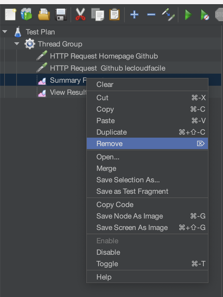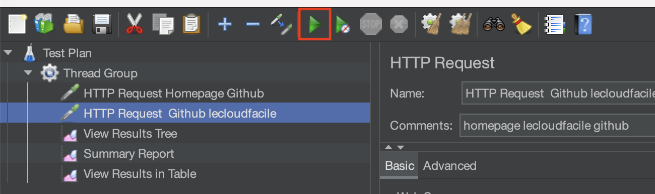 Une fois le plan sauvegardé, on peut désormais lancer nos tests de charge depuis la GUI de Jmeter en cliquant sur le bouton play situé en haut de la barre d'outils