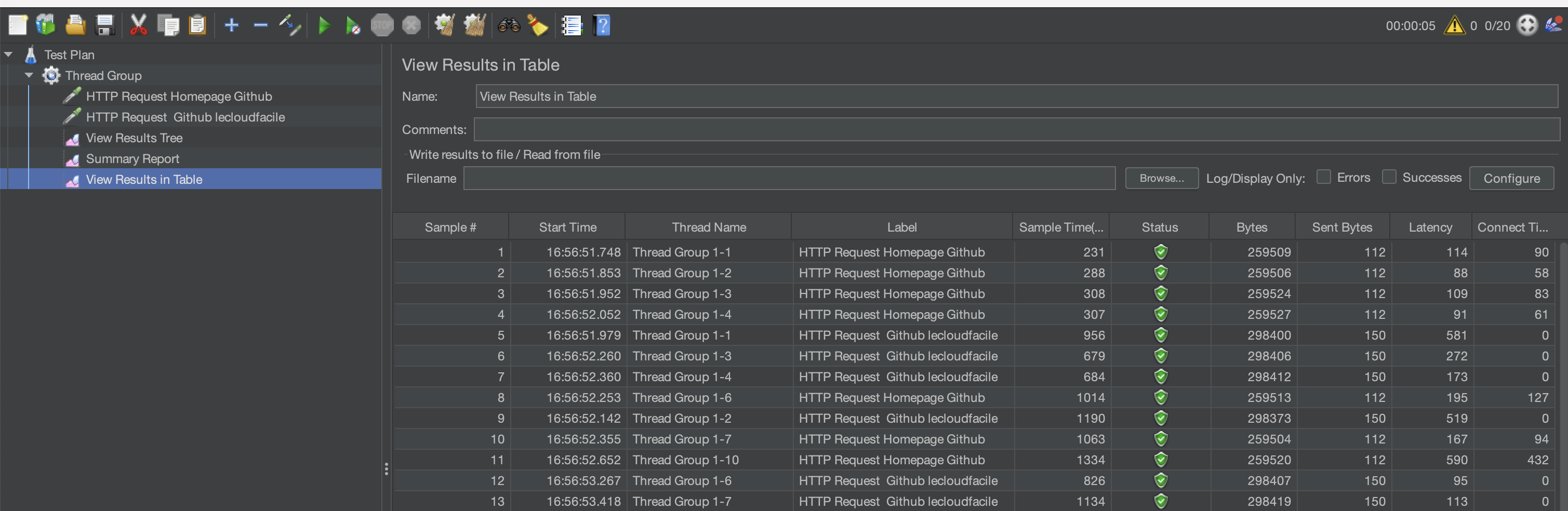 Memes infos que le result tree sous format tableau. On peut voir le temps de connection de chaque requête, son temps de charge, les latence,..