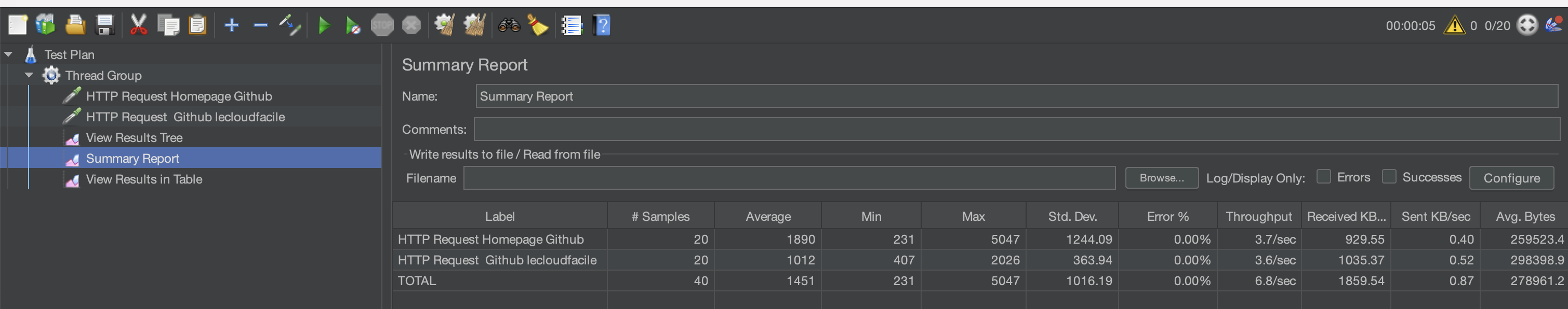 Maintenant on va créer et configurer notre scénario de test de charge vers une application web. On va prendre comme scénario, un test de charge de 20 utilisateurs sur le site github qui héberge nos labs de cloudfacile -> https://github.com/wingufactory/lecloudfacile-devops-labs